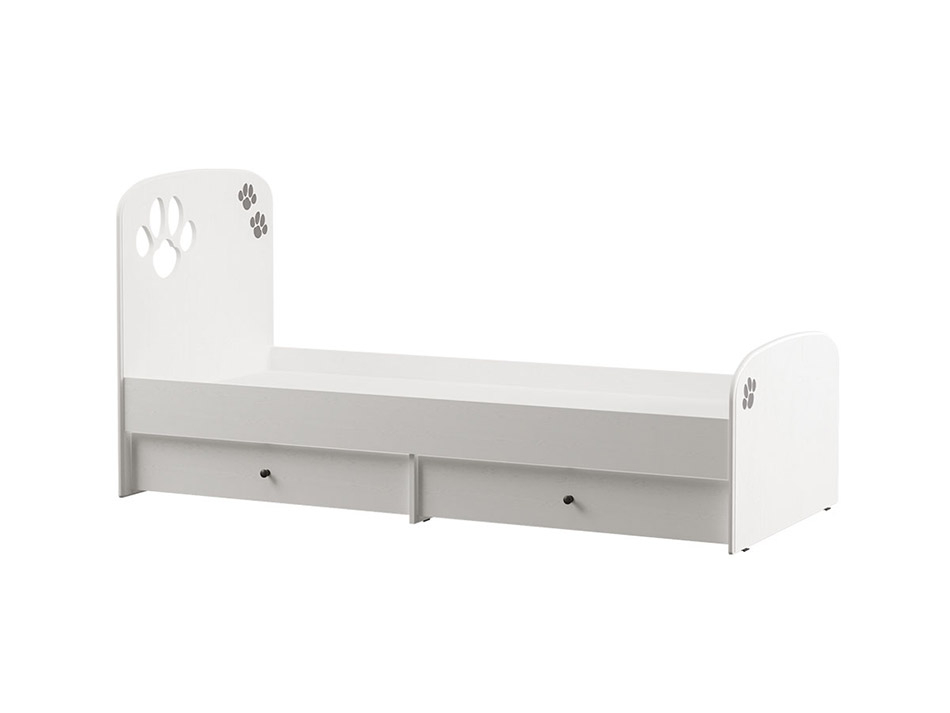 Кровать и комод с минималистичным декором в современном стиле удачно впишутся в любой интерьер и помогут организовать пространство комнаты, при этом не нарушая цветовую гамму уже сложившегося интерьера, а рисунок в виде отпечатков лапок будет напоминать ребенку о любви и бережном отношении к домашним питомцам.