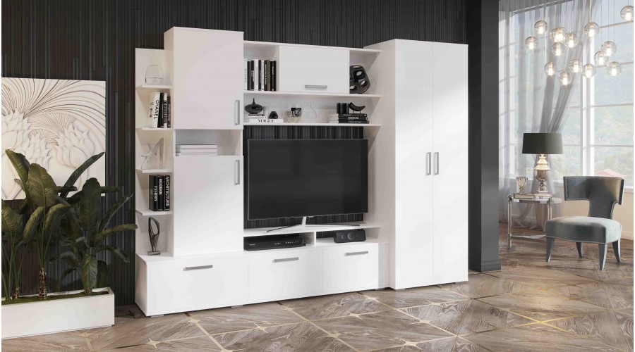 Изготовлена из ЛДСП с кромкой ПВХ, и представлена в белом цвете. Светлый, воздушный дизайн сочетается с практичность: здесь есть и закрытые и открытые полки, ниша под ТВ и приставку.
