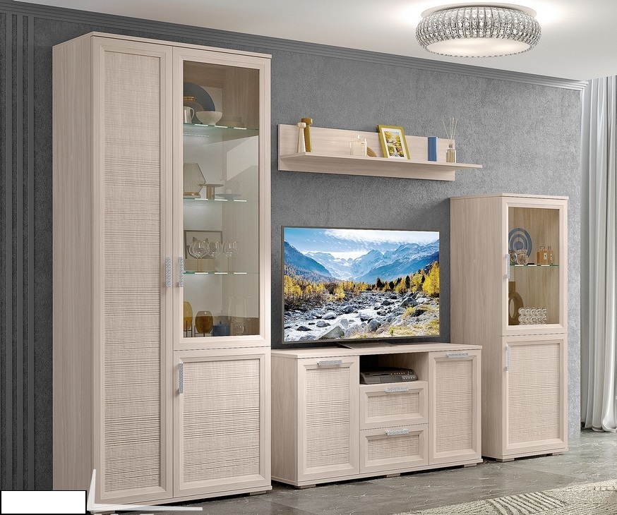 Гостиная Корвет Люкс №8 Шимо светлый - входит в состав большой модульной коллекции Корвет Люкс. Выполнена из высококачественного ЛДСП и МДФ. Стёкла с рисунком и фасады с 3D панелями придают модели особую изысканность. В витрине установлены газовые кронштейны и амортизаторы. В ящиках - полновыкатные направляющие.