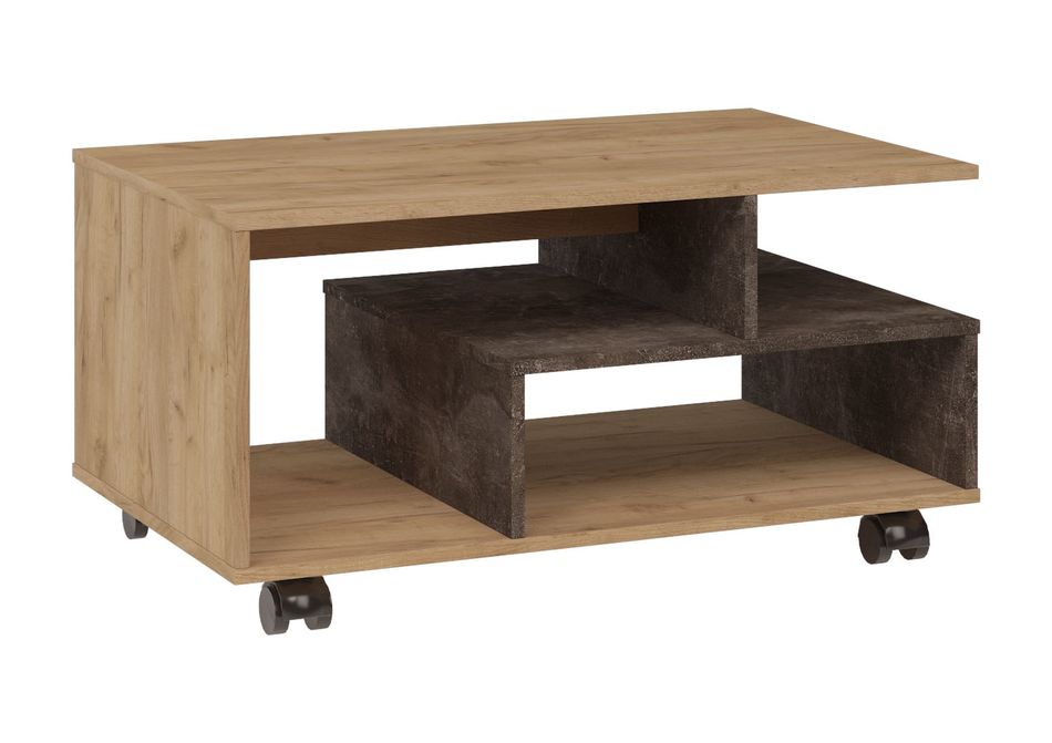 Изготовлена из Эко ЛДСП с декоративными накладками из МДФ, и представлена в цвете Дуб золотой Крафт / Ателье темное. Крепежный элемент - эксцентриковая стяжка. Металлические ручки. Полновыкатные направляющие в ящиках. Задний щит (ДВП) в цвет корпуса. Кромка 2 мм на крышке тумбы.