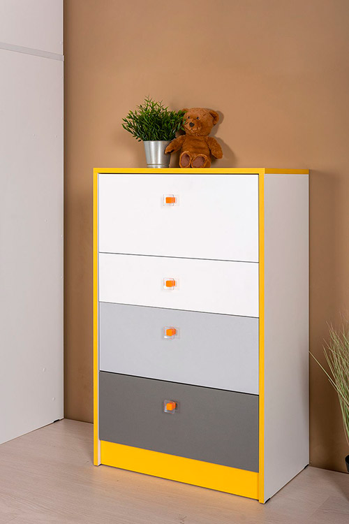 Комод для одежды Альфа 13.120 оригинальная модель для комнаты современного школьника. Стильный дизайн и яркие акценты приведут в восторг любого подростка. Универсальные цвета актуальны как для мальчика, так и для девочки. Система хранения состоит из четырех вместительных выдвижных ящиков с роликовым полновыкатным механизмом. Здесь удобно разместить не только вещи, но и учебные материалы. Поверхность комода можно использовать в качестве подставки под сувениры, игрушки, награды.