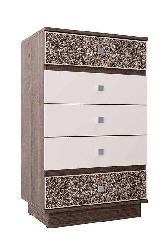Комод представлен в цвете: ясень анкор (темный)/крем гляней/УФ-печать на анкоре темном. Используется кромка 0,4 мм, полновыкатные направляющие на ящиках, ручки металлические.