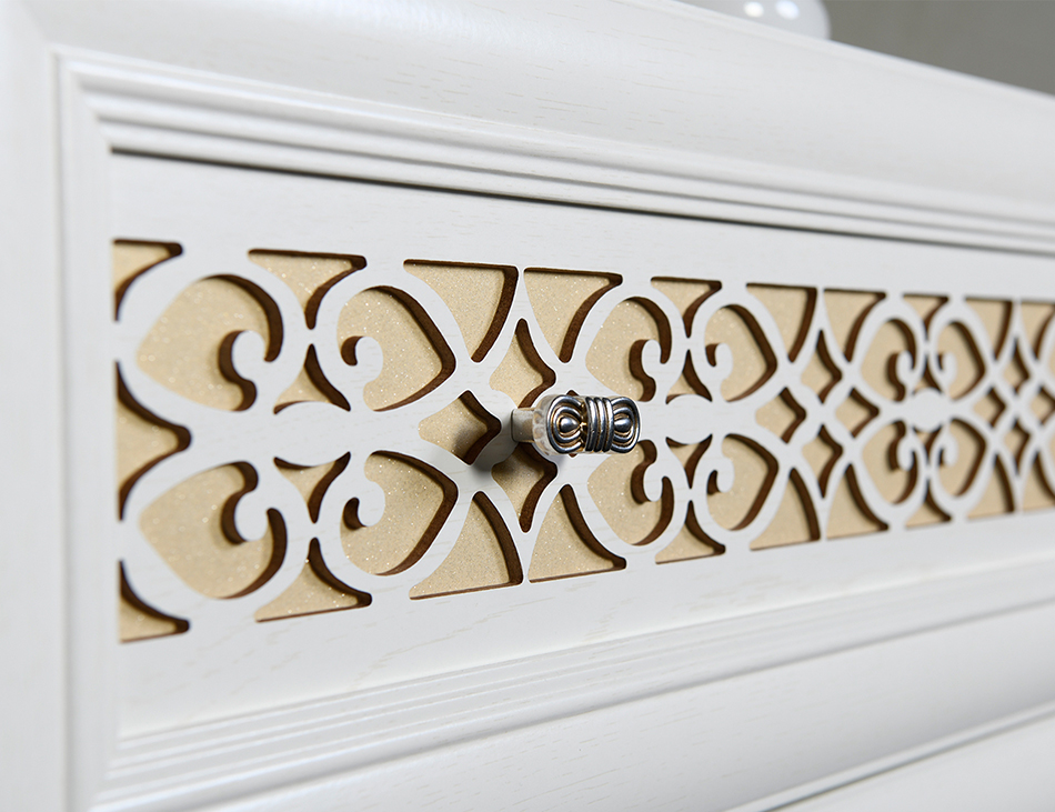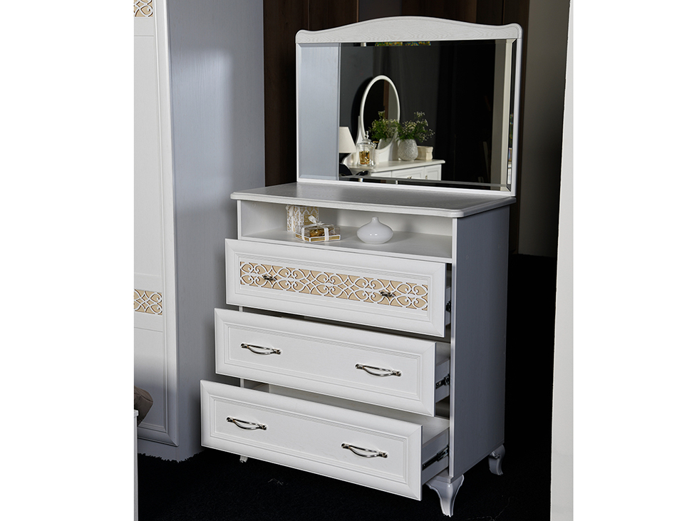 Комод Клауди КД-2 покорит сердца тех, кто любит изысканную классику. Высококачественная фурнитура выполнена в винтажном стиле. Ажурная вставка с золотом придает мебели роскошный вид. Коллекция Клауди позволяет создать гармоничную обстановку, которая способствует полноценному отдыху и комфортному времяпровождению. Комод содержит три выдвижных ящика и открытую нишу.