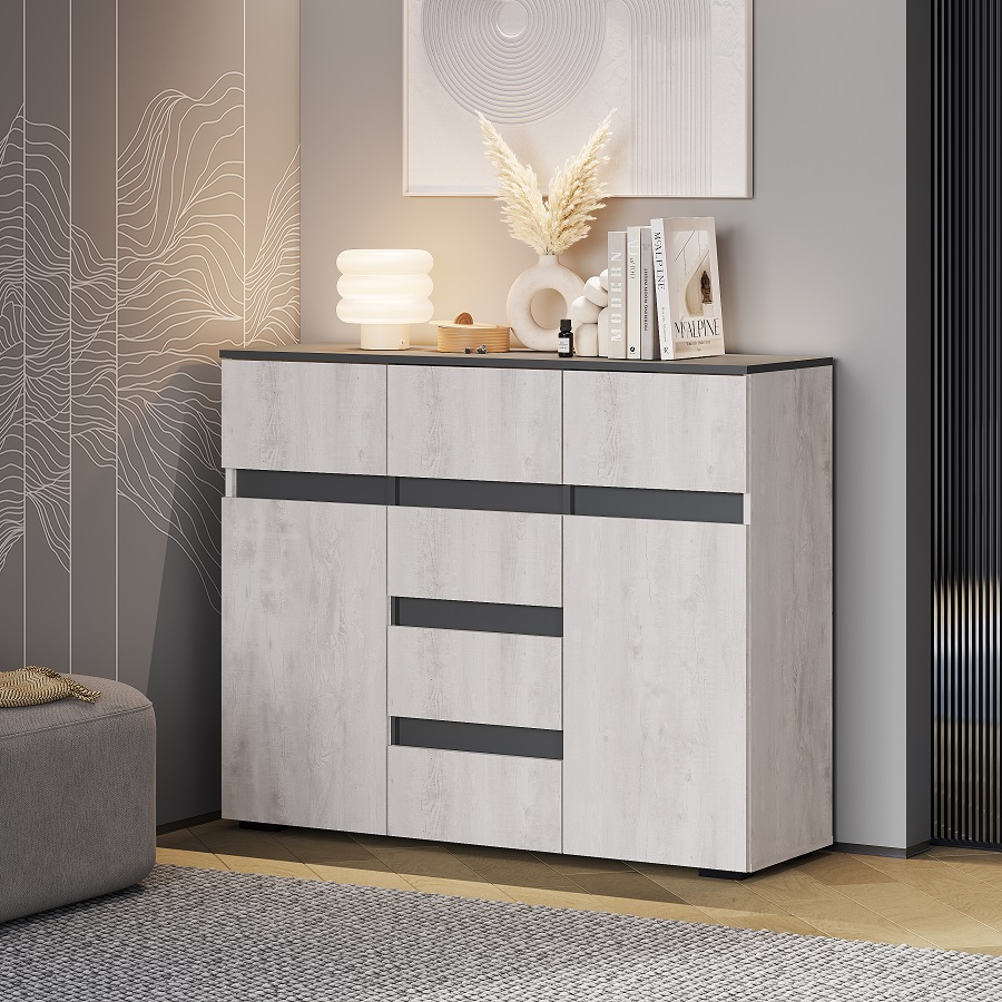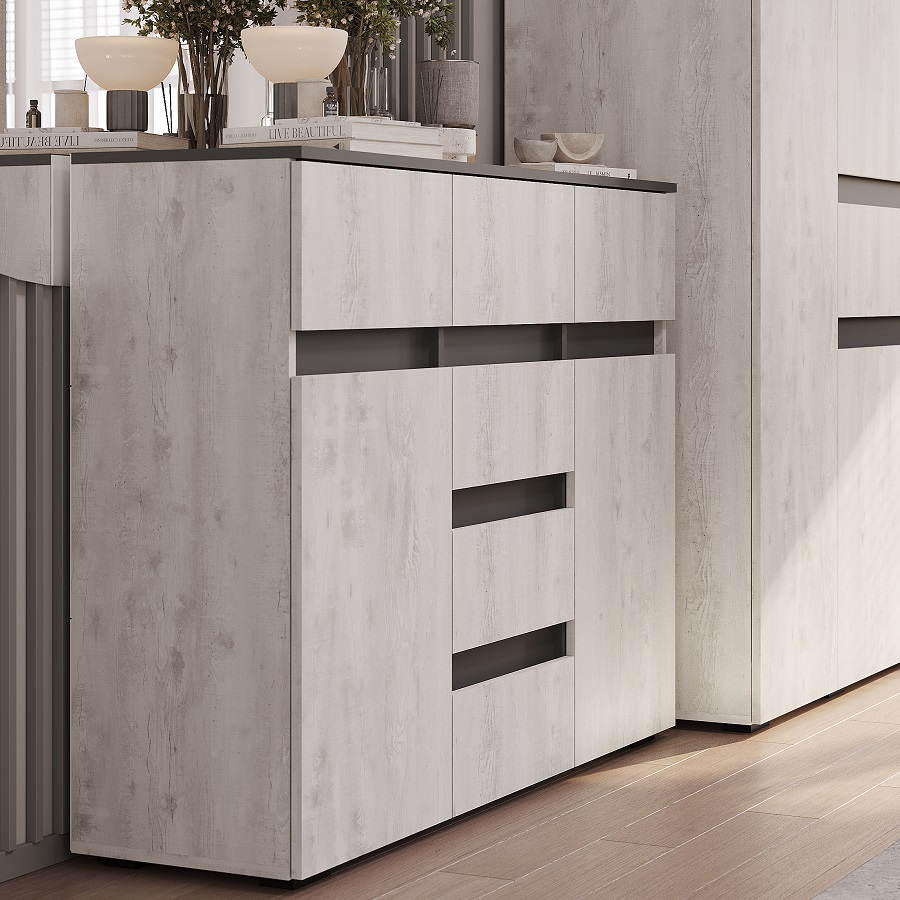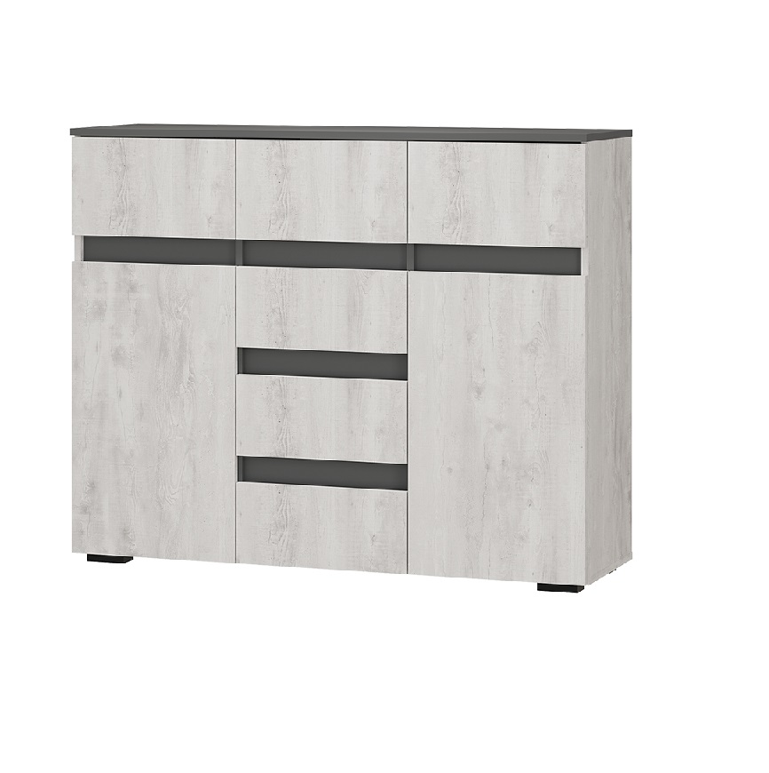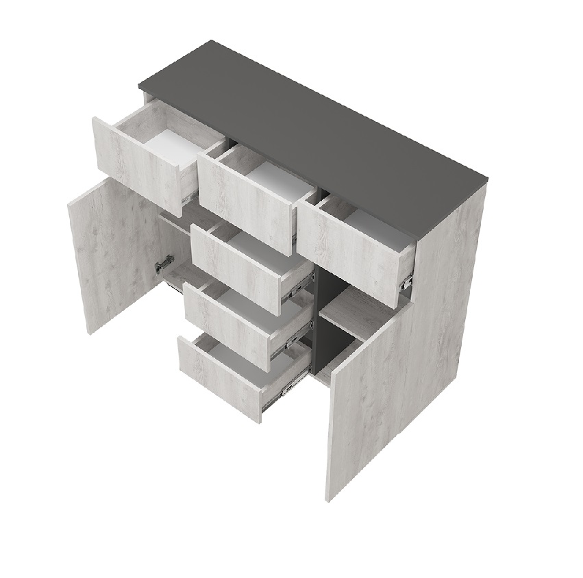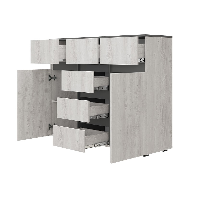 Комод «Мрия» состоит из 2 боковых зон с полками и 6 ящиков, в которых удобно хранить постельное бельё и мелочи. Изготовлен из ЛДСП, в цвете Бетон Пайн белый и Графит.