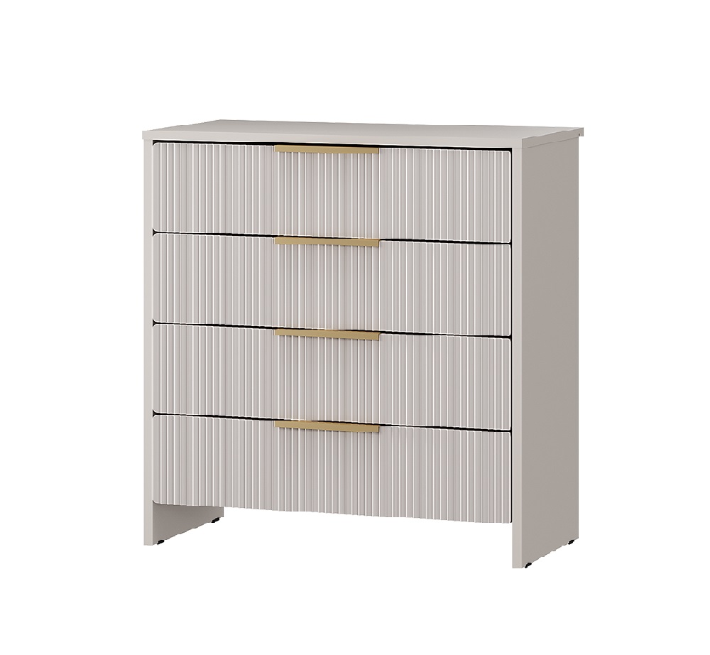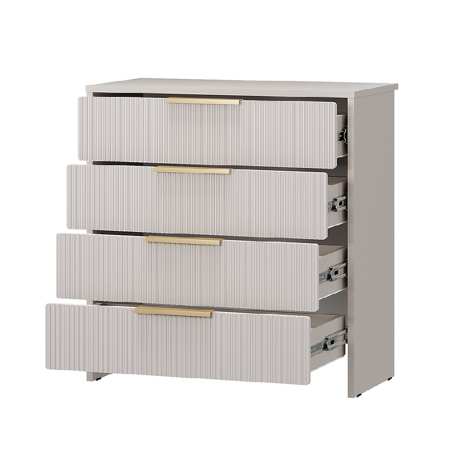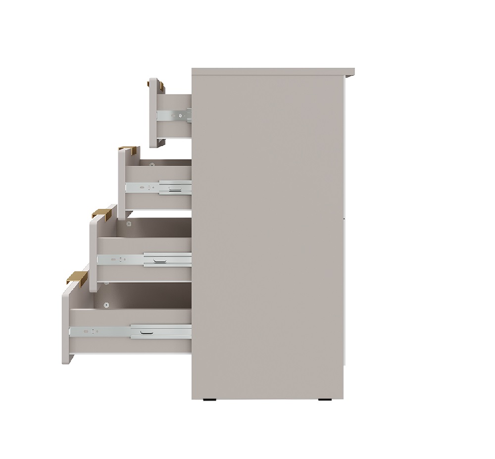 Толщина кромки 0,4 мм, ручки пластиковые в цвете Пыльно-матовое золото, опоры-подпятники пластиковые. Элегантная фрезеровка на фасадах. Ящики на полновыкатных направляющих. Максимальная нагрузка на ящик – 5 кг.