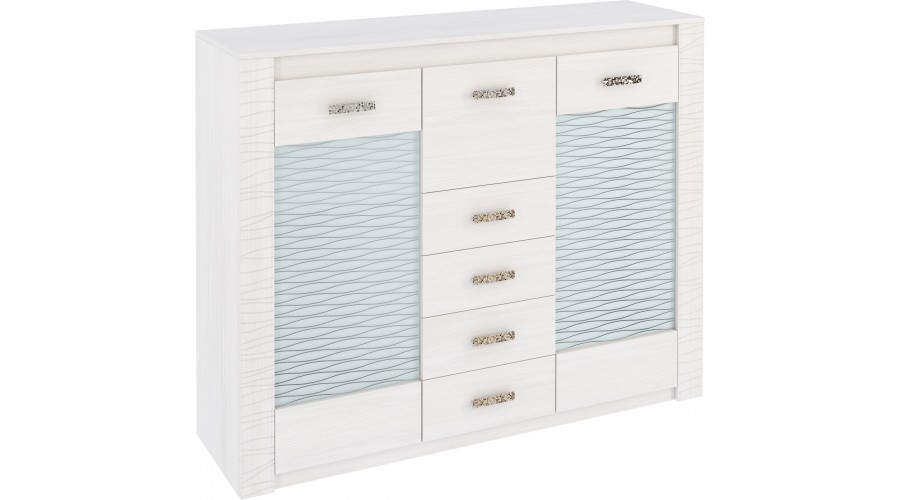Комод Ривьера-Л - прекрасный выбор для светлого, чистого интерьера гостиной. Один из модулей коллекции с одноименным названием. Материал изготовления - ЛДСП 16 мм, накладки - МДФ. Цвет - Анкор светлый. Кромка ПВХ. Стёкла с ненавязчивым геометрическим рисунком.