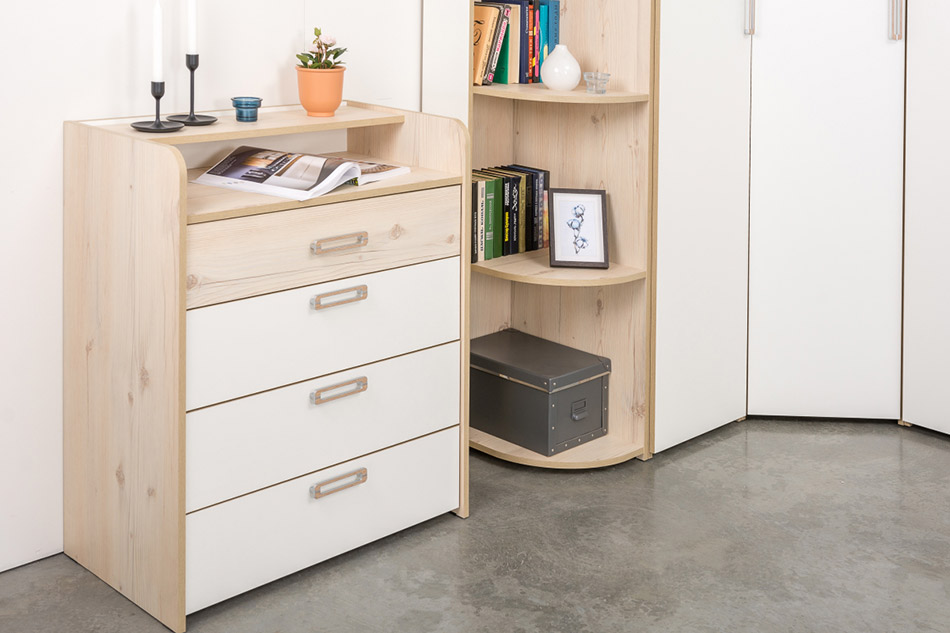 Комод 13.103 имеет 4 ящика, которые укомплектованы шариковыми направляющими полного выдвижения, ящики закрываются мягко и бесшумно. Функционал комода идеально подойдет для хранения белья.