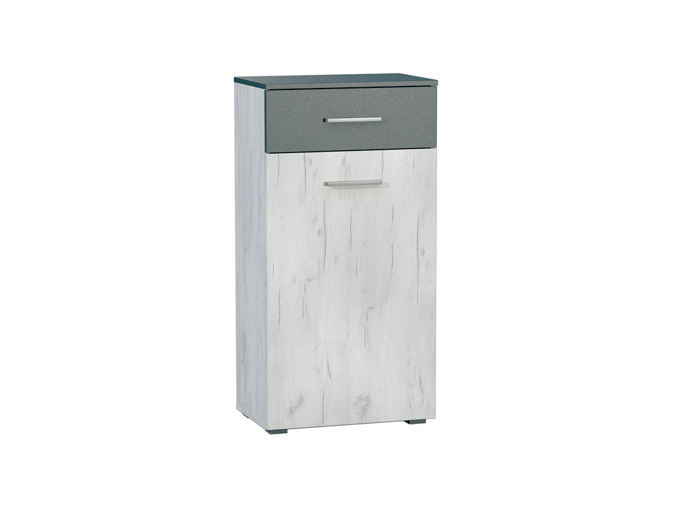 Комод Юнона - современный дизайнерский комод для вашей прихожей. Входит в состав прихожей Юнона. Гармонирует по цвету со всеми модулями в прихожей и прекрасно справляется со своей задачей за счет вместительных полок. Может так же устанавливаться в спальне, прихожей, гостиной, детской. Комод выполнен в цветах Дуб белый крафт и серый шифер. Каркас комода сделан из качественного ЛДСП. Ручка ящика пластиковая (цвет "сатин"). Задний щит (ДВП) в цвет корпуса. В комоде 3 полки и 1 ящик на роликовых направляющих.
