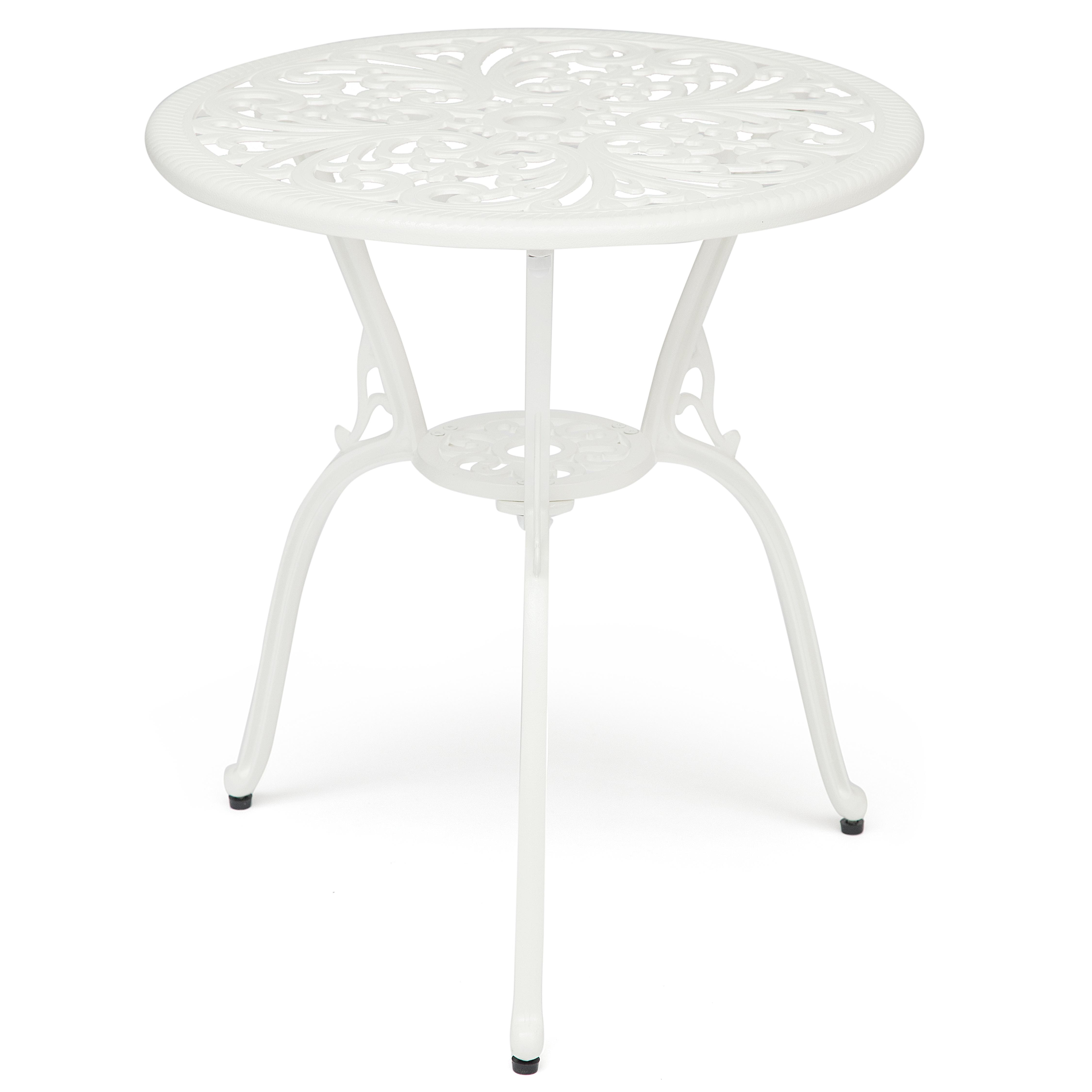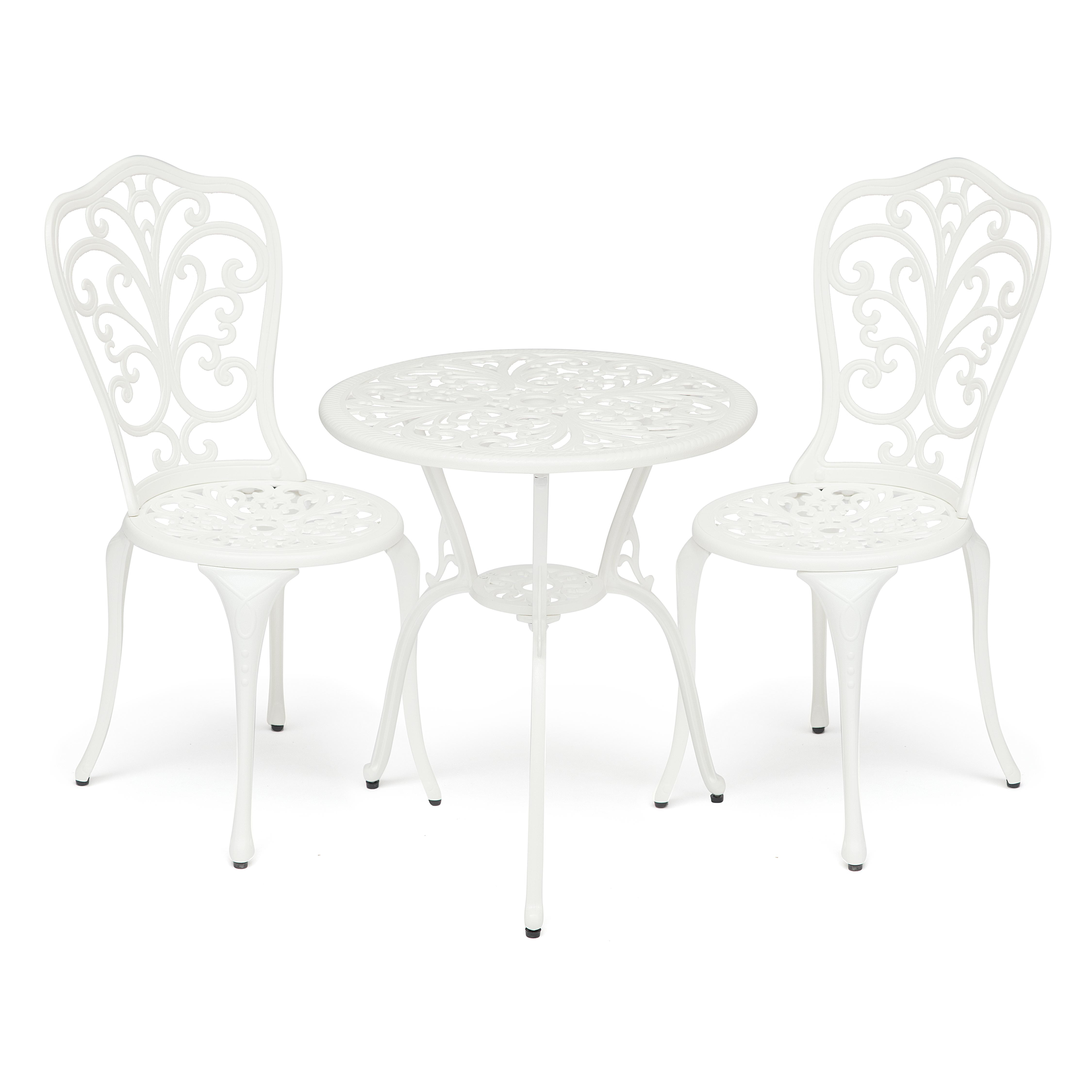 Изысканный комплект кованой мебели Romance состоящий из стола и двух стульев, будет прекрасно смотреться в загородном доме, на дачной веранде, отлично подойдёт для отдыха на приусадебной лужайке. Высокое качество и красота неповторимых ажурных узоров столешницы и спинок стульев добавит благородства в ваш ландшафтный дизайн, подчеркнет вкус и статус своего владельца. Устойчивый стол на трех ножках, дополненный миниатюрной нижней полочкой, и два удобных стула выполнены из литого алюминия и покрашены в белый цвет. Эта функциональная, прочная и красивая мебель займет важное место в оформлении вашего сада. Комплект устойчив к любым погодным условиям и будет радовать вас долгие годы своим первоначальным видом.