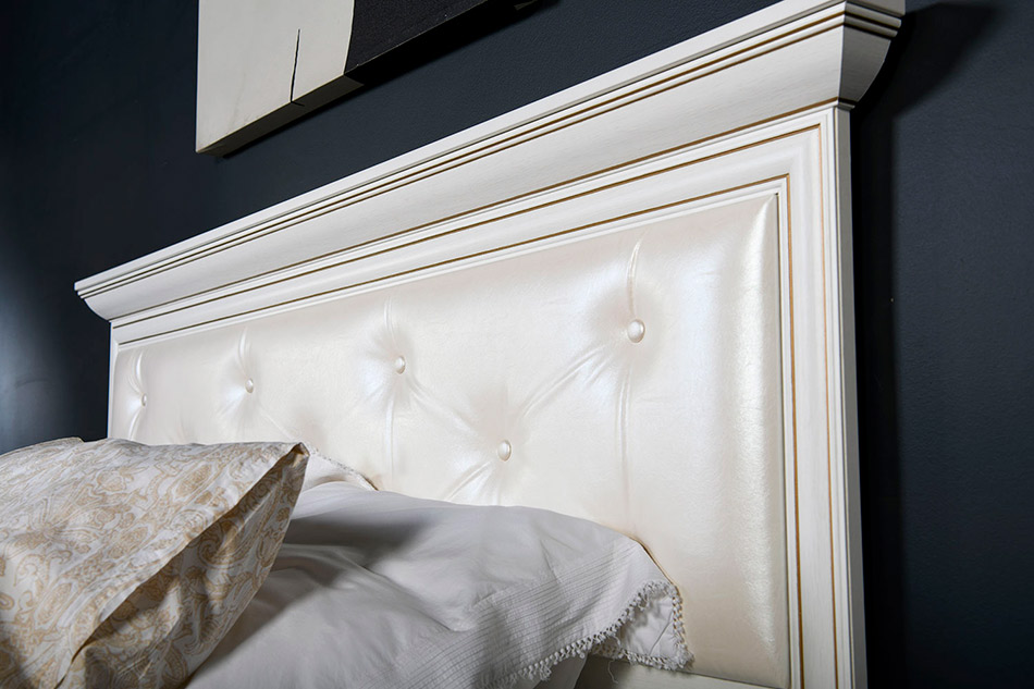 Корпус - ЛДСП, фасад - МДФ. Двойная система объемных карнизов. Кровать укоплектована ортопедическим основанием на ножках.