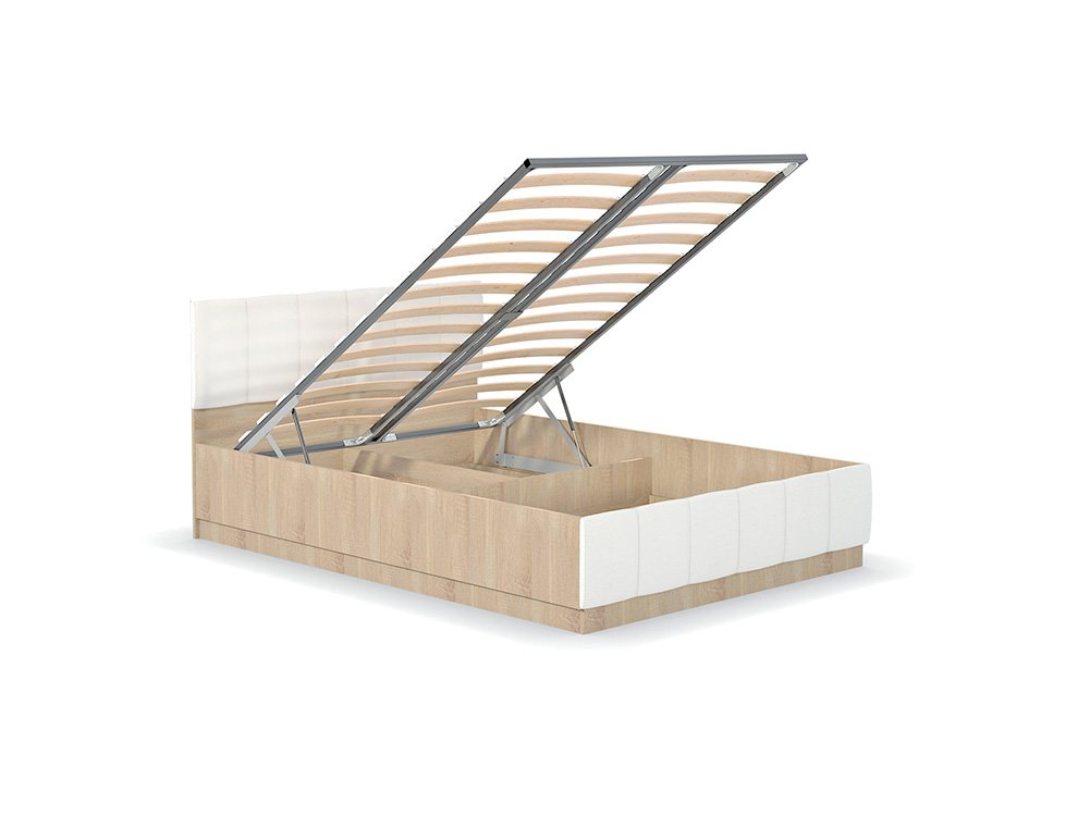 Кровать с подъемным механизмом Линда 303 - стильная кровать с мягкими вставками из белой кожи. Спокойные тона позволят вписаться этой кровати в любой дизайн. Входит в комплект спальни Линда. В этой кровати ваш сон глубоким и здоровым. Спинка у головы позволяет вам читать или смотреть телевизор в удобной позе. Кровать выполнена в цвете Дуб Сонома, кожаные вставки сделаны из кожзама Гранд Белый. Каркас сделан из высококачественного ЛДСП. Комплектуется основанием с ламелями. Рекомендуемая высота матраса 18 см.