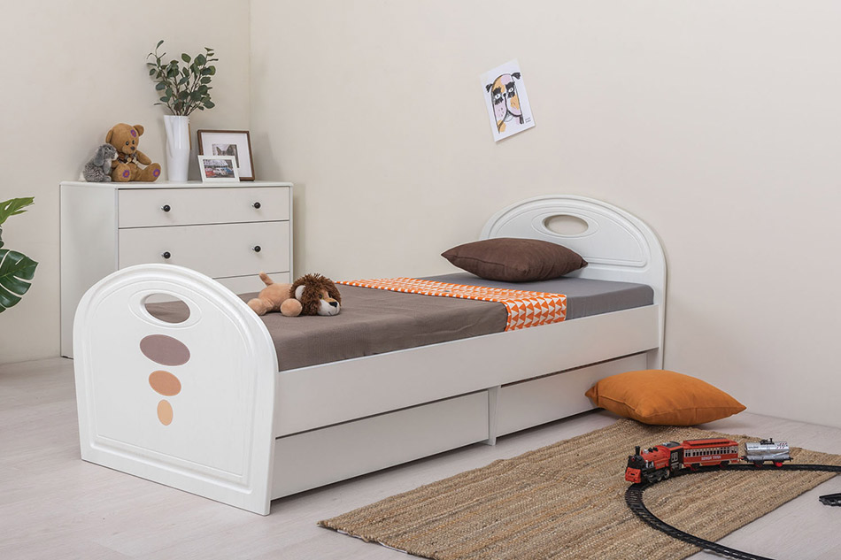 Удобная система хранения поможет организовать порядок в комнате вашего ребенка, при этом отсутствие лицевой фурнитуры позволяет поставить кровать в интерьер любого стиля.