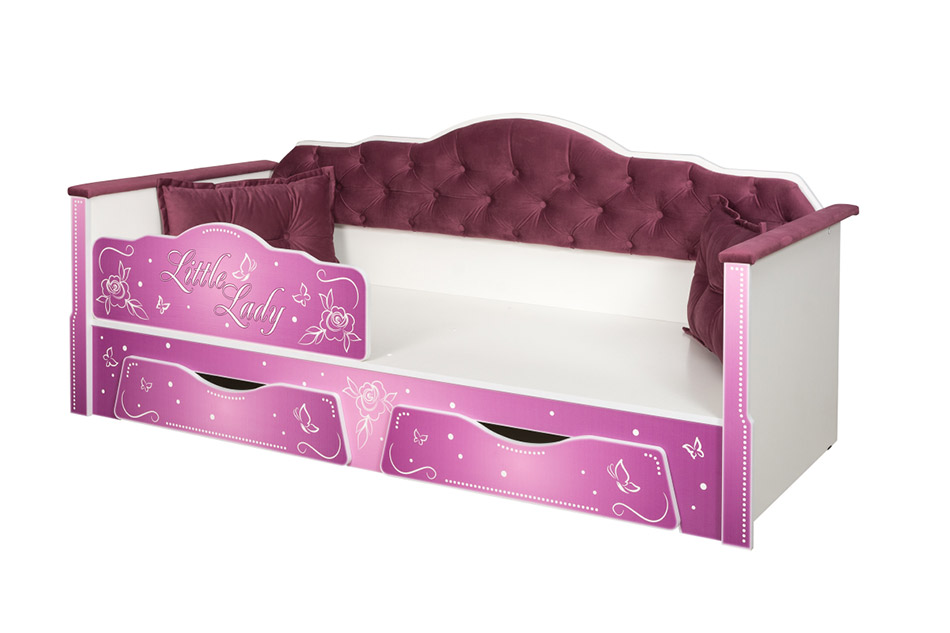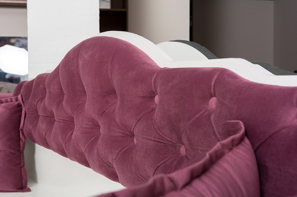 - яркое исполнение — бирюзовый или бордовый велюр с каретной стяжкой, белый каркас с древесным тиснением и яркая фотопечать помогут сделать обстановку интересной.