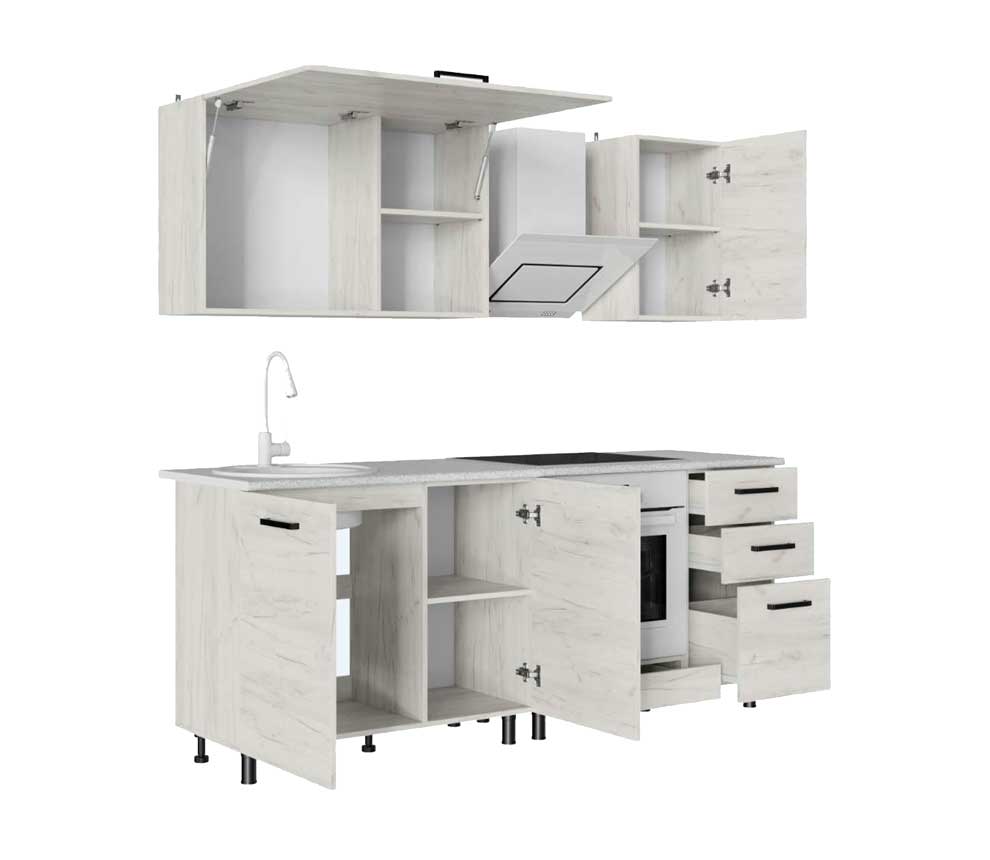 мойки. Стол с ящиками разработан для использования встраиваемого духового шкафа. Навесной горизонтальный шкаф разработан для использования посудосушителя.
