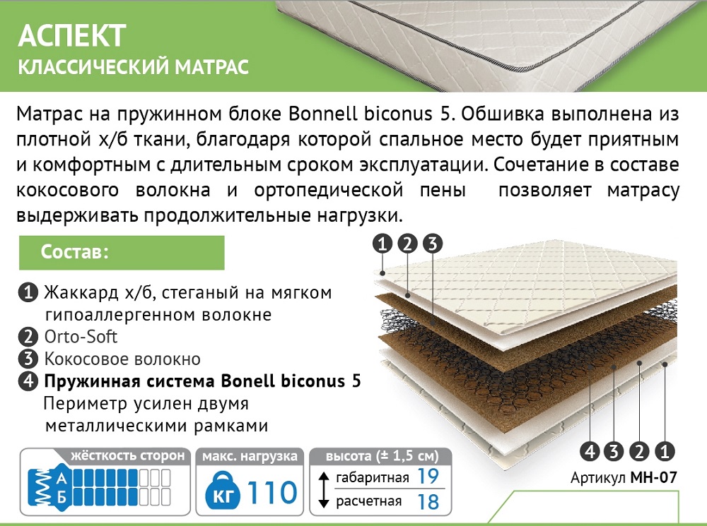 Высота 18 см. Жесткость: одна сторона - средняя, вторая сторона - средняя. Максимальная нагрузка на одно спальное место: 110 кг. Срок службы 10 лет.