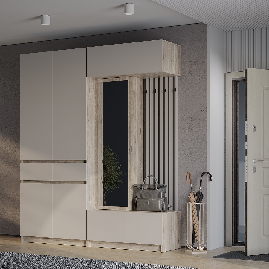 Универсальное расположение шкафа относительно тумбы с вешалкой и зеркалом.