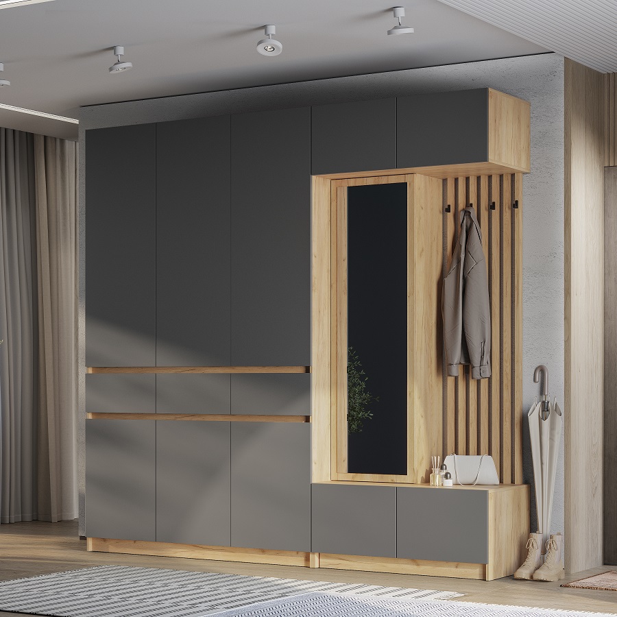 Универсальное расположение шкафа относительно тумбы с вешалкой и зеркалом.