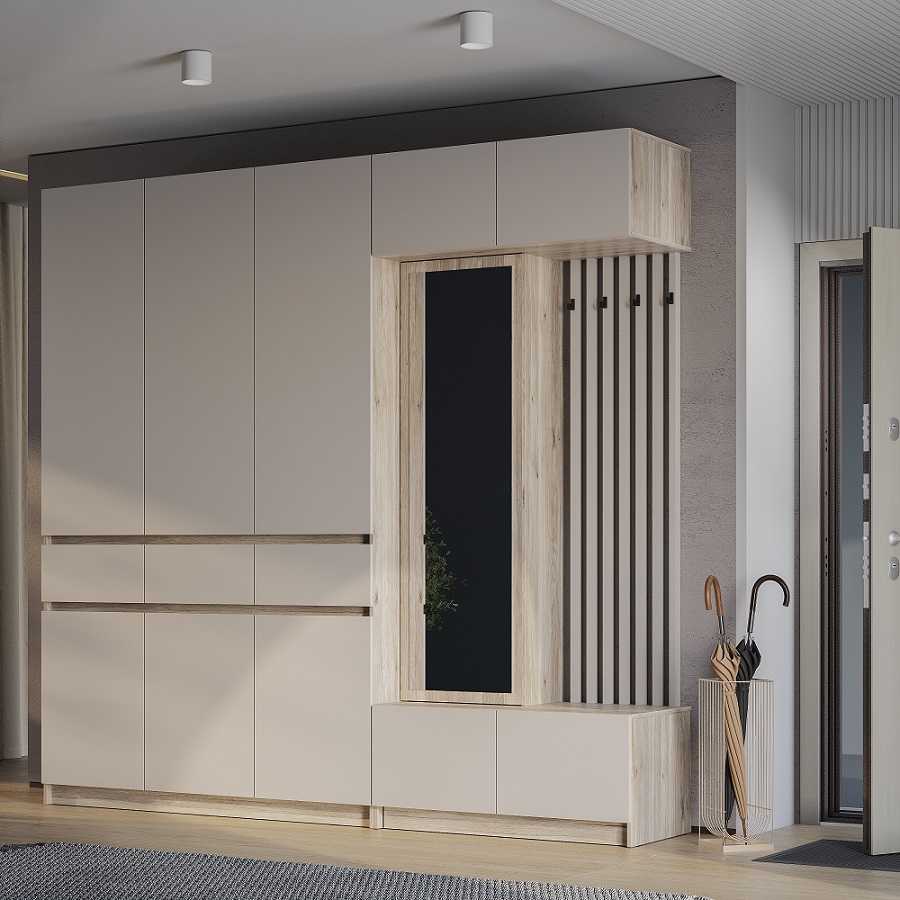 Универсальное расположение шкафа относительно тумбы с вешалкой и зеркалом.
