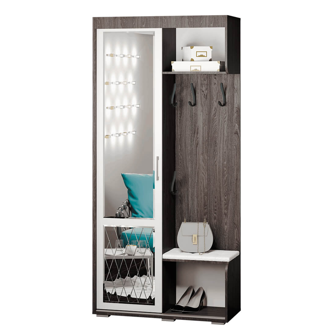 Прихожая-купе Варда - стильная, современная, и, что не мало важно, вместительная прихожая, которая отлично подойдет, как для загородного дома, так и для квартиры. Цвет каркаса - шимо темный. Зеркало в белой раме. Собирается как на левую, так и на правую сторону. Сиденье - экокожа кремового цвета.