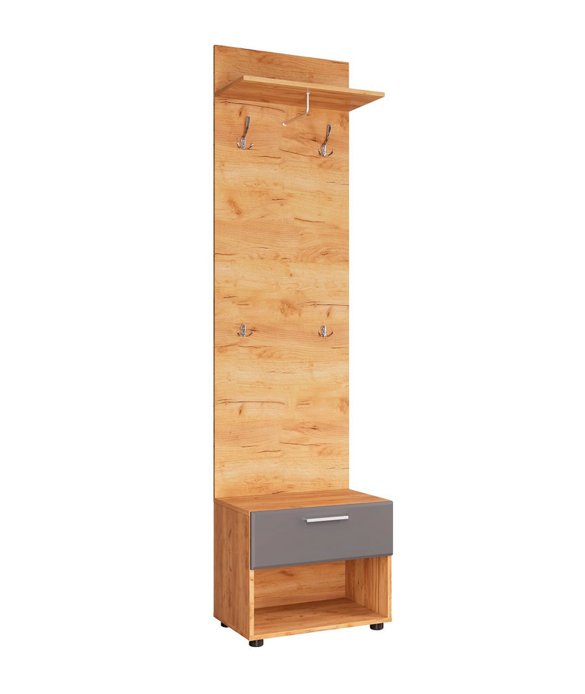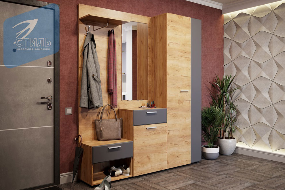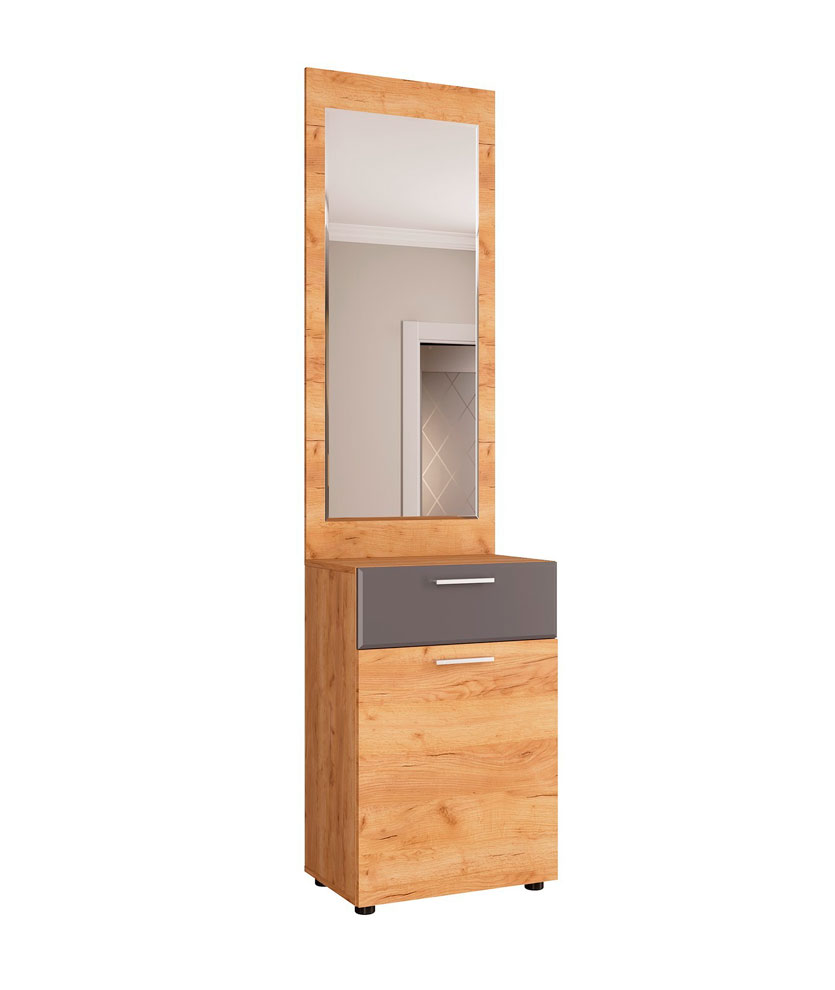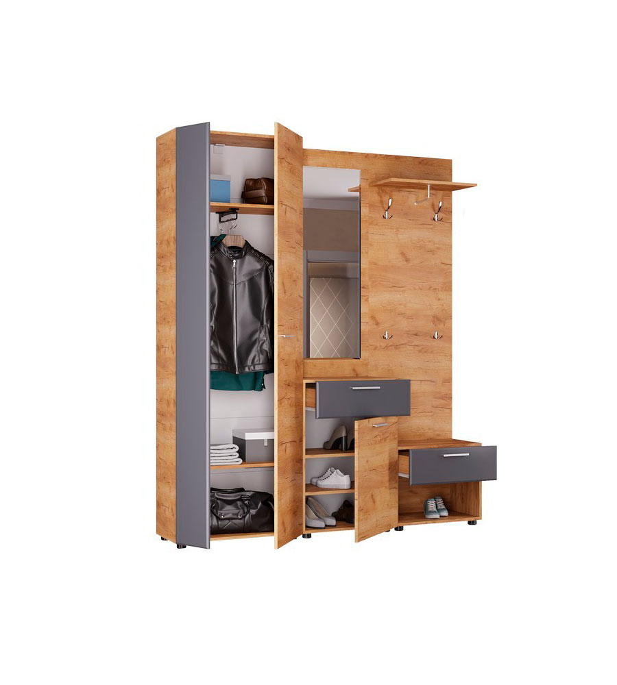 Прихожая Сафари комплект №1 - состоит из трех модулей: шкаф 2-х створчатый, вешалка с тумбой и зеркало с тумбой. Корпус изготовлен из ЛДСП цвета Дуб крафт золотой, фасад - МДФ в цвете Графит софт и ЛДСП Дуб крафт золотой. Кромка ПВХ 0,4 мм. Ящики на полновыкатных шариковых направляющих. Зеркало 4 мм с комбинированной обработкой края "Фальцет". Наполнение шкафа: две полки, выдвижная штанга.