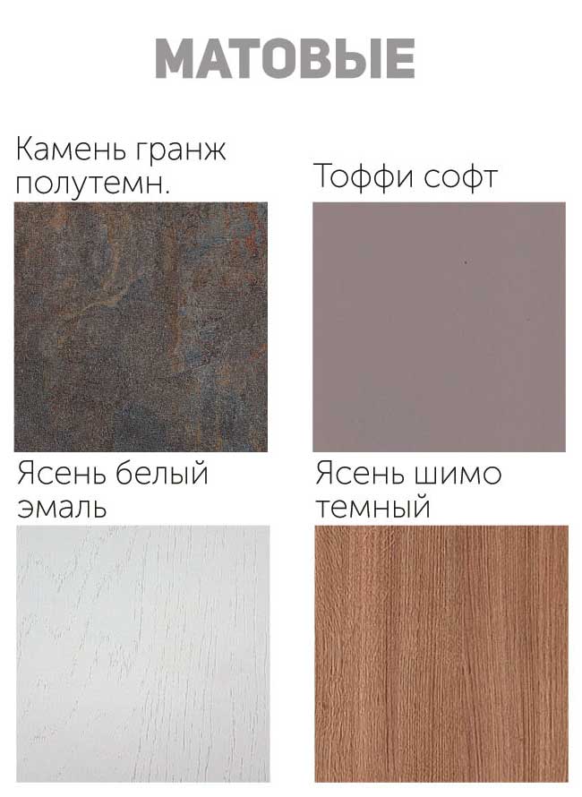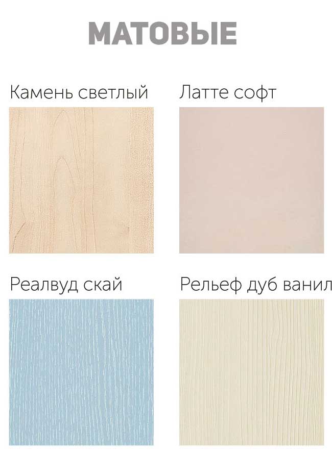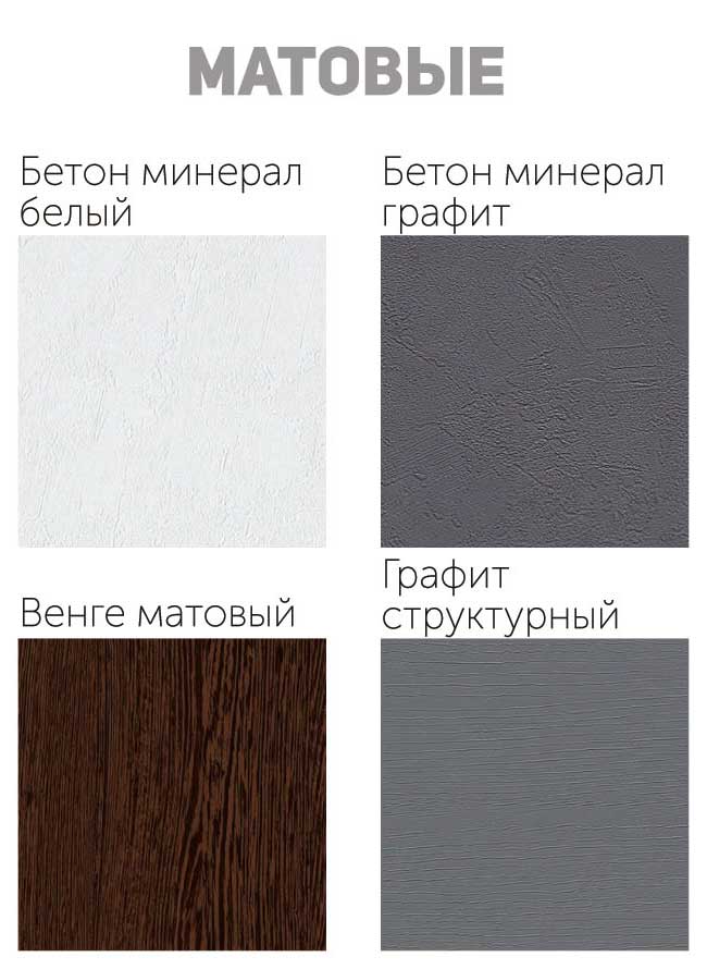 Варианты цветаБетон минерал белый (матовый), Бетон минерал графит (матовый), Бриз Софт (матовый), Ваниль Софт (матовый), Венге (матовый), Графит структурный (матовый), Джинс светлый (матовый), Камень темный (матовый), Камень светлый (матовый), Латте софт (матовый), Массив айс (матовый), Массив деним (матовый), Реалвуд скай (матовый), Рельеф дуб ваниль (матовый), Рельеф дуб кофе (матовый), Риф лайм (матовый), Камень гранж полутемный (матовый), Тоффи софт (матовый), Ясень белый эмаль (матовый), Ясень шимо темный (матовый), Баклажан (глянцевый), Белый глянец (глянцевый), Ваниль (глянцевый), Венге (глянцевый), Зеленое яблоко (глянцевый), Кофе с молоком (глянцевый), Манго (глянцевый), Мускат (глянцевый), Олива (глянцевый), Шоколад (глянцевый), Алый (металлик), Белый (металлик), Бирюза (металлик), Гранат (металлик), Оранжевый (металлик), Розовый (металлик), Фиолетовый (металлик), Синий (металлик), Сиреневый (металлик), Бетон пепельный (матовый эко), Дуб шале графит (матовый эко), Дуб классика (матовый эко), Бетон снежный (матовый эко), Дуб шале коричневый (матовый эко), Палисандр белый (матовый эко), Палисандр натуральный (матовый эко)