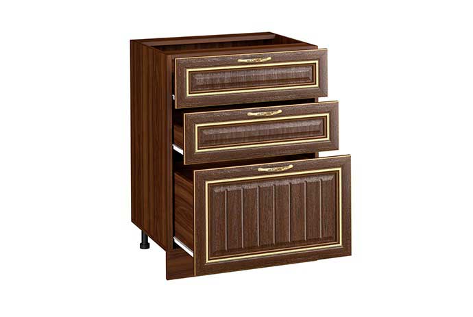 РС-3Я-60 для кухни Гурман-2 Экко Дуб темный - входит в состав модульной кухни Гурман-2 Экко Дуб темный. Корпус изготавливается из ЛДСП в цвете Орех Пегасо. Фасады выполнены из МДФ с 3D-резьбой в цвете Экко Дуб темный. Все ящики на полновыкатных (шариковых) направляющих.