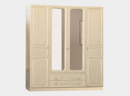 Шкаф 4-х дверный Верона - изысканный прямой шкаф с зеркалами. Представлен в сочетании цветов: фасад - Жемчуг глянец, корпус - Бодега бежевая. Эта модель отличается неповторимым стилем и отличным качеством. На зеркалах - защитная пленка. Фасад украшен объемным рисунком, выполненным с применением технологии 3D фрезерования.