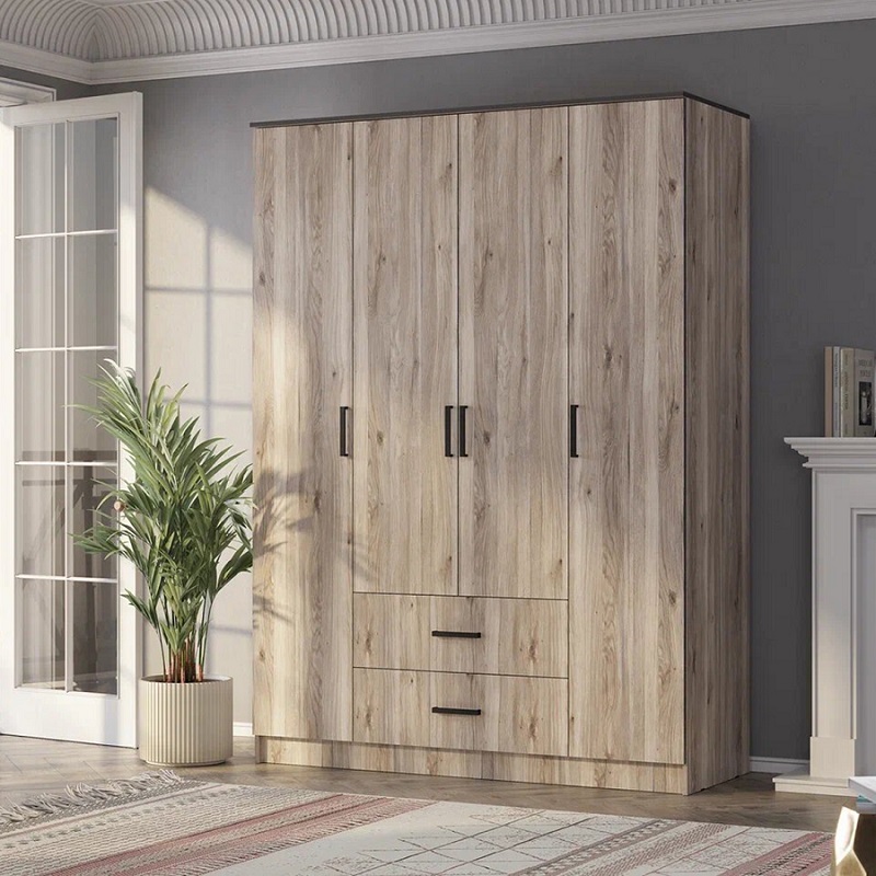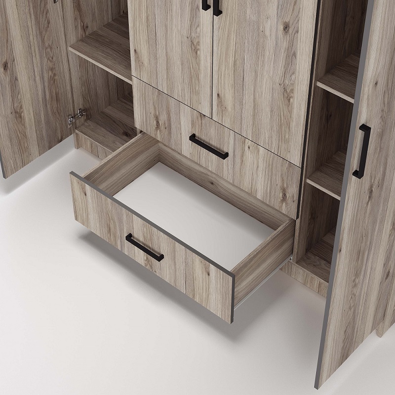 Шкаф 4-х створчатый Титан в трендовом древесном декоре Дуб Смоки отлично впишется в интерьер вашей квартиры или дома. Кромка 0,45 мм, вместительные ящики на роликовые направляющих, ручки пластиковые, продольная штанга. Максимальная нагрузка на ящики - 5 кг, на полку - 10 кг.