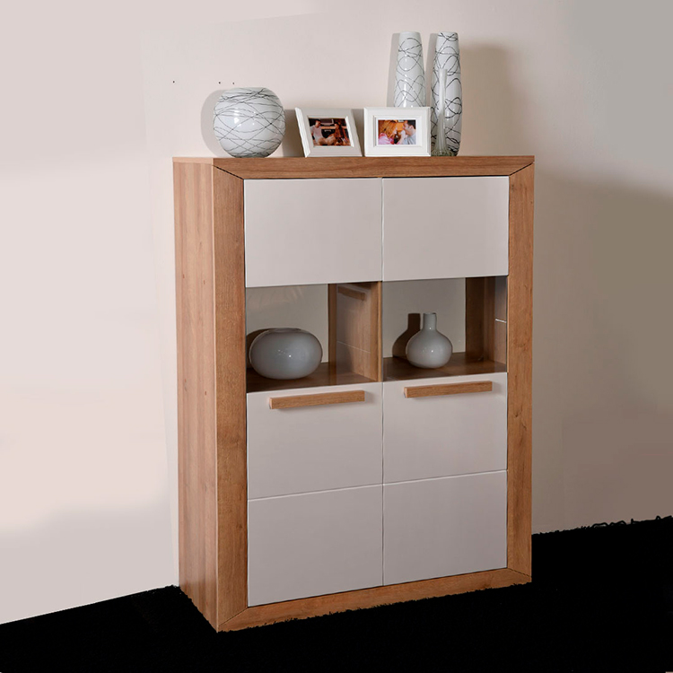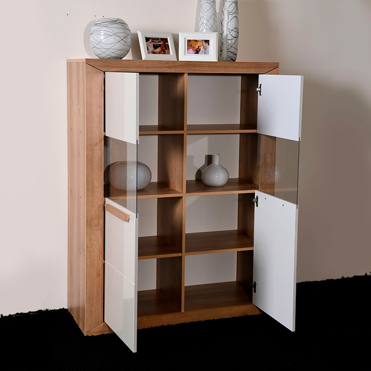 Шкаф Бостон БС-3 - элемент для гостиной в современном стиле с глянцевой белой поверхностью. В шкафу две двери со стеклянными вставками. Внутри за каждой дверью три полки.