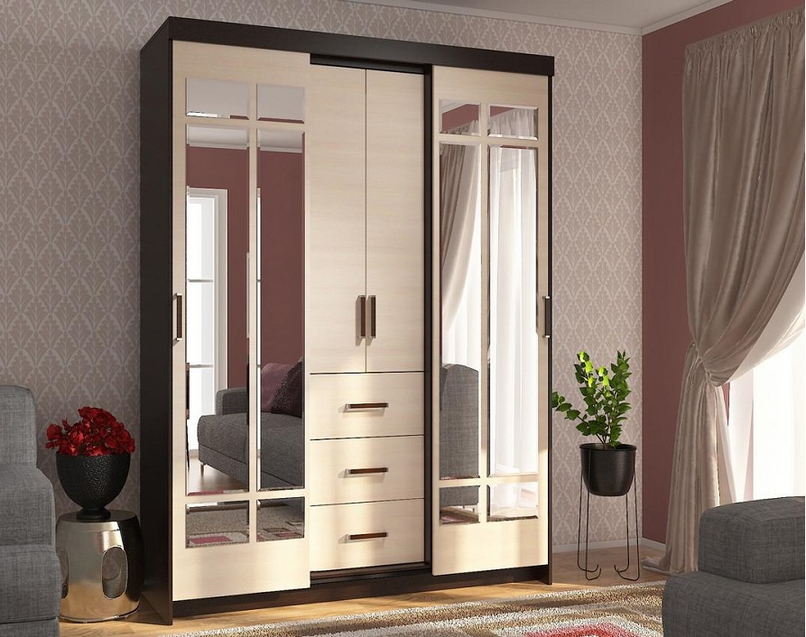 Шкаф-купе Комфорт-6М Венге/Дуб молочный выполнен в классическом стиле из экологичных материалов. Надежная и удобная в использовании фурнитура, вместительные ящики, декоративные зеркала на створках купе.