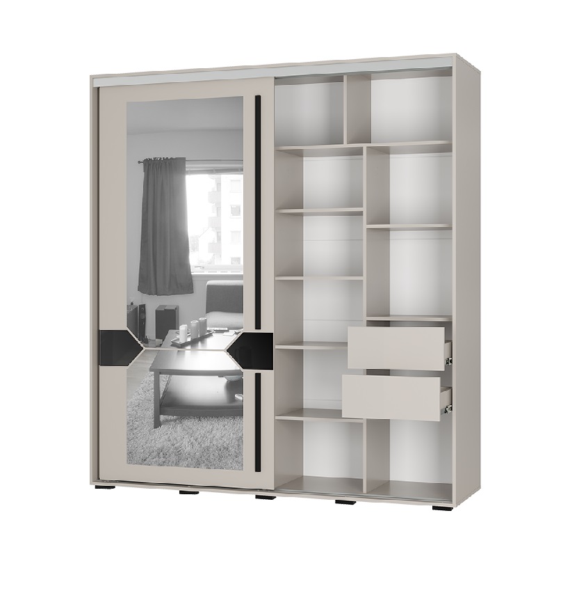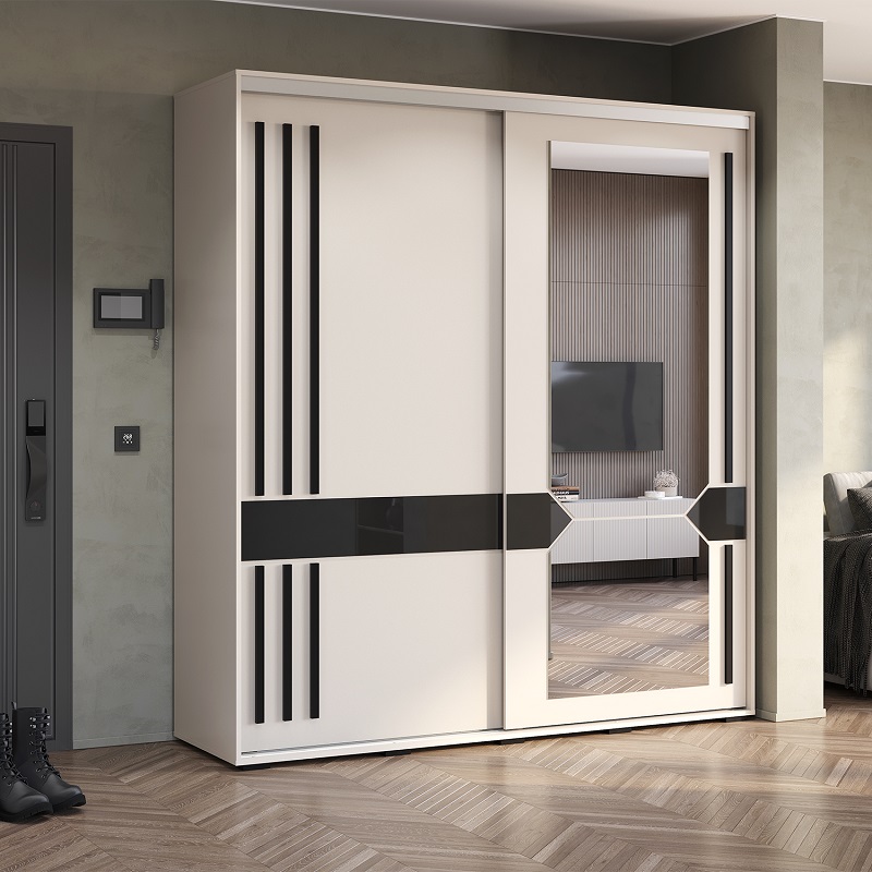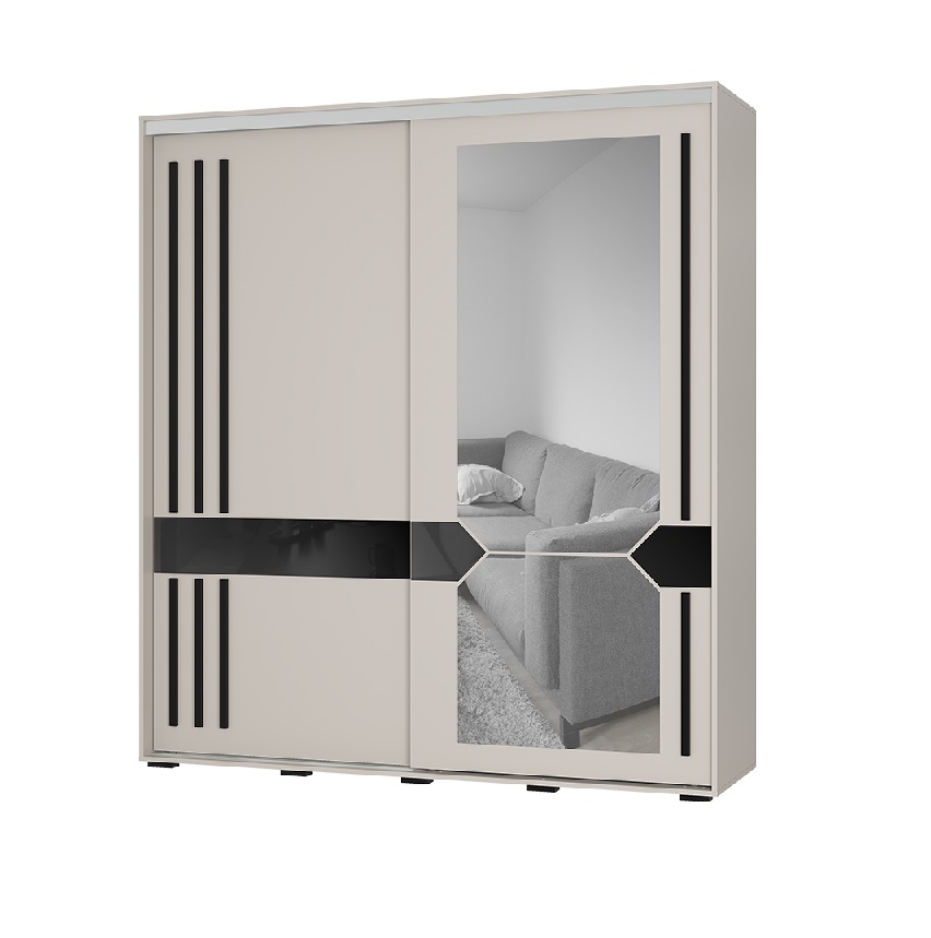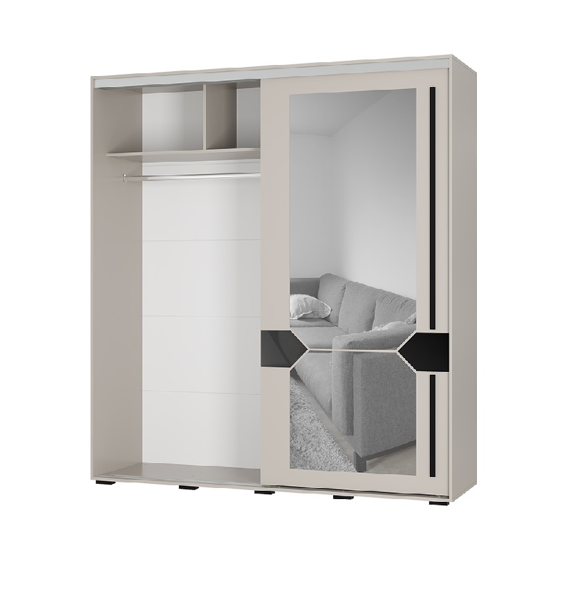 Зеркало - тип обработки ерокромка. Лакобель черного цвета с типом обработки стекла еврокромка. Механизм открывания дверей - нижнеопорная система "Рамир".