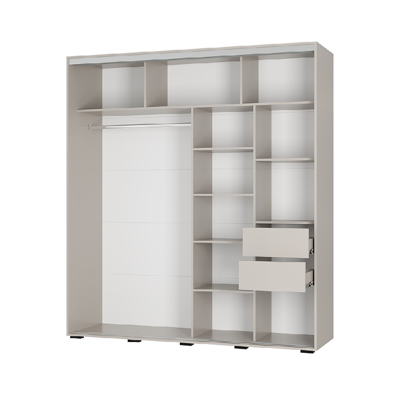 Шкаф-купе "Крафт-9" представлен с всовременном и трендовом декоре "кашемир". Его мягкий, природный оттенок создает приятную атмосферу и визуально расширяет пространство. Двери шкафа оснащены стильными длинными вставками из черного МДФ - профиля, выполняющими роль ручек. Шкаф украшен роскошным зеркалом с интересной геометрической формой, которое не только выполняет свою практическую функцию, но и становится изысканным акцентом. Лакобель в черном цвете добавляет интерьеру глубину и шарм, придавая ему стильный и солидный вид.