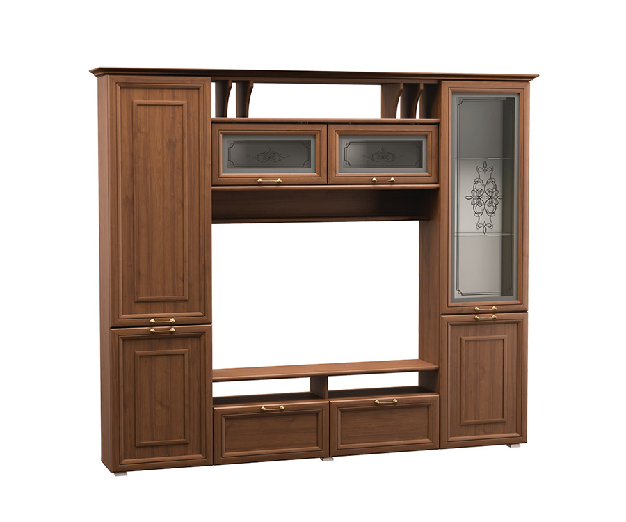 Шкаф многоцелевого назначения Катарина 10.22 - это классическая стенка для гостиной теплого орехового оттенка гармонично впишется в интерьера. Модель имеет не только солидный внешний вид, но и вместительную систему хранения. Центральная часть конструкции представляет собой ТВ-тумбу, под которой находятся две открытые ниши, для размещения пульта или приставки, и два полновыкатных ящика на шариковых направляющих. По бокам расположены два закрытых вертикальных блока с полками, где удобно хранить множество необходимых предметов: от одежды до посуды. Одна дверка шкафа представляет собой витрину из прозрачного стекла с фотопечатью. Верхняя часть стенки оборудована широкой открытой полкой с отсеками под книги документы, а также двумя шкафчиками с откидными витринными дверцами на газлифтах.