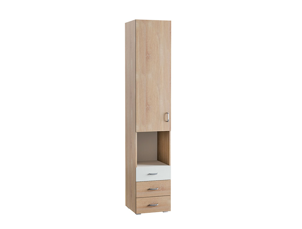 Шкаф-пенал Линда - компактный и вместительный шкаф для прихожей. Стильный двухцветный пенал подойдет в любую комнату. Входит в модульную прихожую Линда. Большое количество полок и ящиков позволяет разместить в нем все самое необходимое. Шкаф выполнен в цветах Дуб сонома и Белый. Фасад дверцы пенала и дверц ящиков изготовлен из ЛДСП. В дверях установлены 4-х шарнирные петли, ручка двери металлическая. Выдвижные ящики на роликовых направляющих. Задний щит (ДВП) в цвет корпуса. Наполнение шкафа - 4 полки и 3 ящика.