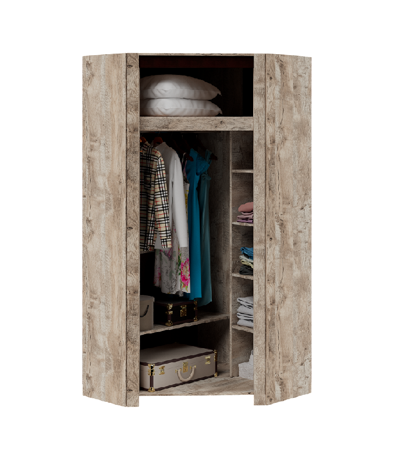 Шкаф угловой Хилтон - универсальная модель порадует вас своей функциональностью. За распашными дверями с оригинальными ручками расположено отделение с полками, большое пространство со штангой для одежды, а также вместительная верхняя полка.