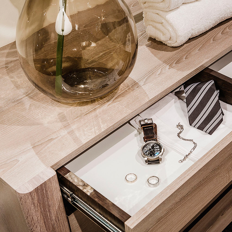 Корпус - ЛДСП, фасад - МДФ. Петли на фасадах с системой плавного закрывания (доводчики). МДФ накладки скруглены и облицованы антивандальной пленкой ПВХ. Ящики оснащены бесшумной системой полного выдвижения. Спальня представлена в единственном цвете - Ясень Таормина/Венге.