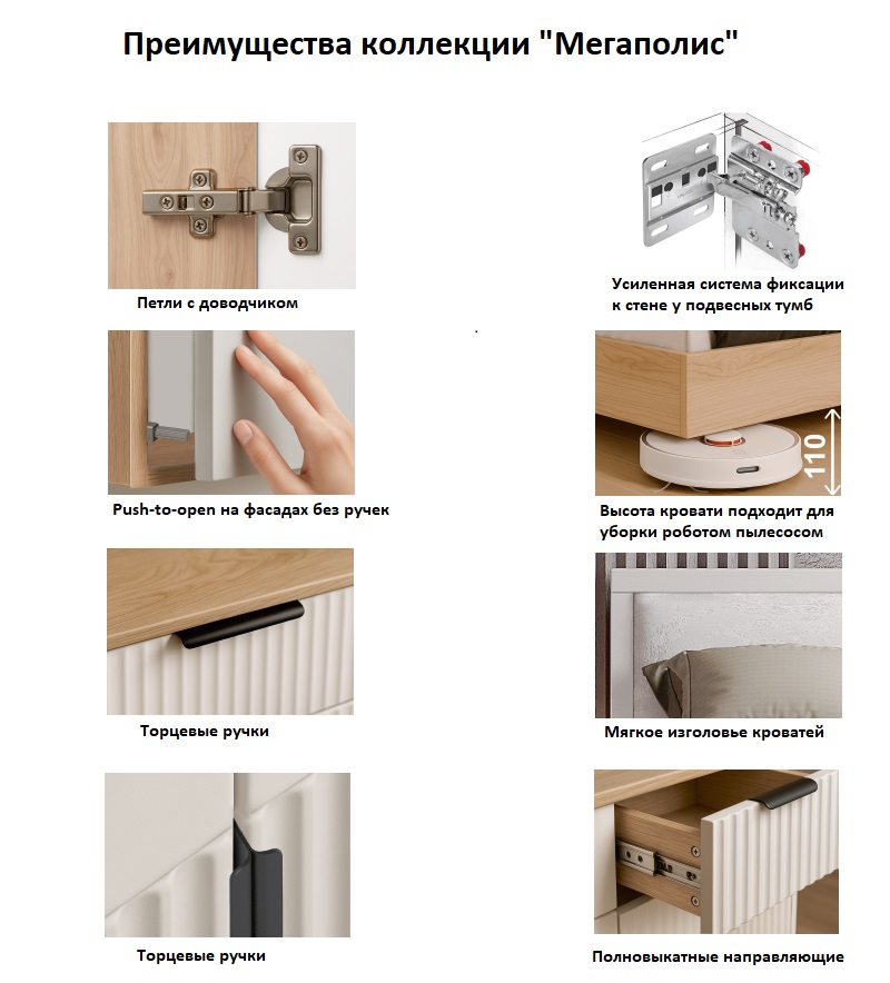 Стильная современная прихожая Мегаполис Керамик Софт риф - станет изюминкой вашей прихожей. Фасады рифленые изготовлены из МДФ в цвете Керамик Софт, корпус - ЛДСП в цвете Гикори Джексон. Полновыкатные направляющие на ящиках, на дверях петли с доводчиками. Металлические ручки.