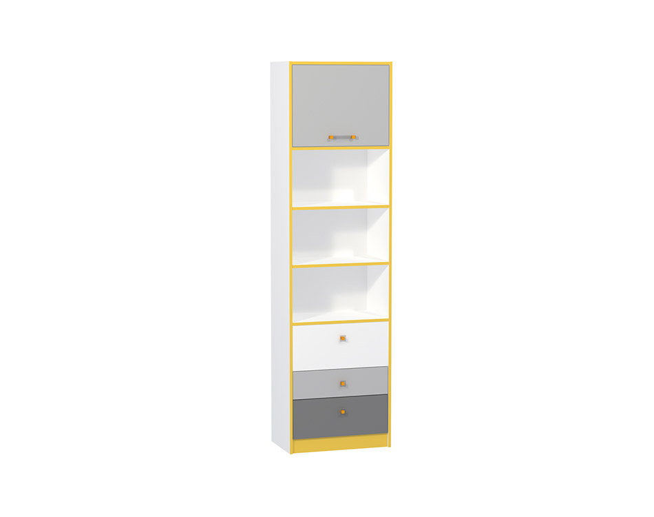 Стеллаж Альфа 09.137 оригинальная модель для комнаты современного школьника. Стильный дизайн и яркие акценты приведут в восторг любого подростка. Универсальные цвета актуальны как для мальчика, так и для девочки. Система хранения стеллажа состоит из трех выдвижных ящиков, закрытой секции с откидной дверцей и трех открытых полок. Модель достаточно компактная, она не займет много места, но в то же время организует рабочее пространство в школьном уголке. В стеллаже удобно разместить учебники и папки с рабочими материалами, а также сувениры, грамоты.