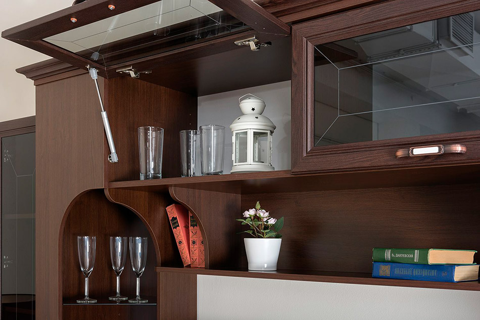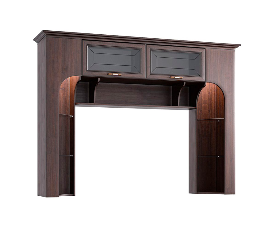 Стеллаж Мадэра 10.140 - это широкий стеллаж-витрина, надстройка для гостиной. По бокам расположены открытые ниши, на каждой из которых по две полки. В центральной части открытая полка и два ящика за стеклянными дверцами на газлифтах.