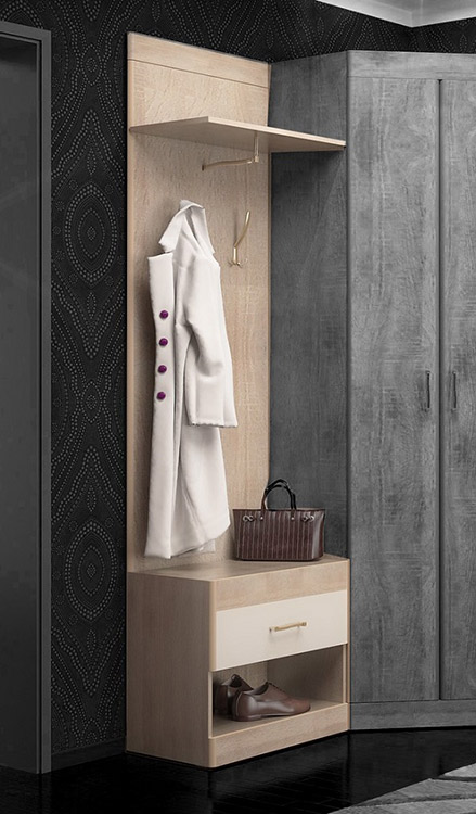 Стойка-вешалка Ника Н-4 - универсальный модуль для компактной прихожей. Вешалка оборудована одной штангой и двумя крючками, на которые удобно вешать ключи, зонты и сумки. Обувь можно убрать в выдвигающийся ящик или поставить под него. Вверху полка для головных уборов.