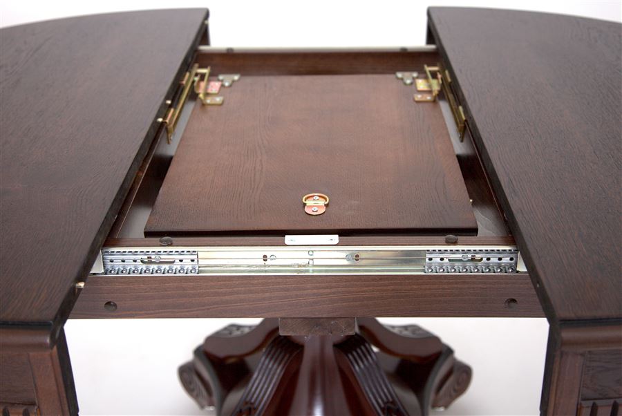 Массивный, раздвижной стол на фигурной ноге. Выполнен из массива бука. Верх столешницы отделан натуральным шпоном. Представлен в цвете: Темный орех + патина черная. Ножка стола поставляется в сборе.