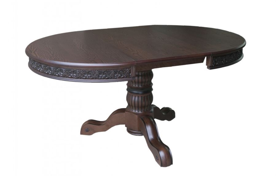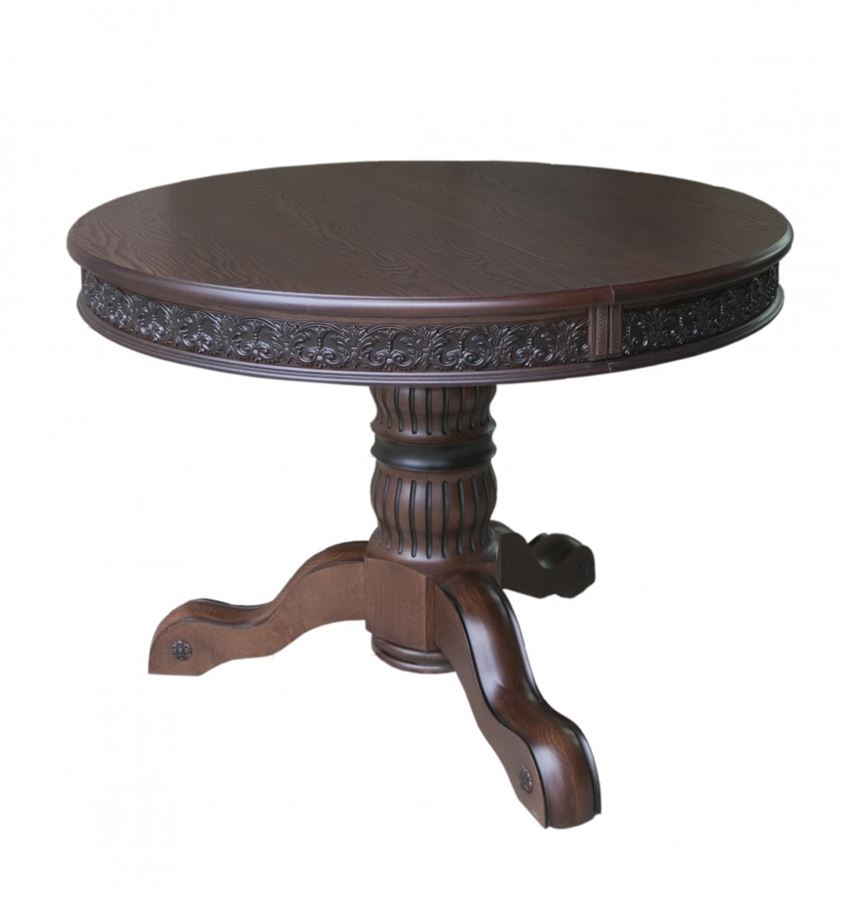 Массивный, раздвижной стол на фигурной ноге. Выполнен из массива бука. Верх столешницы отделан натуральным шпоном. Представлен в цвете: Орех. Вставка стола хранится отдельно.
