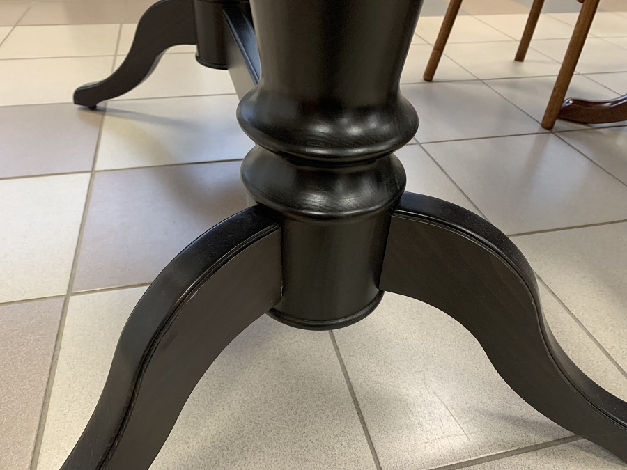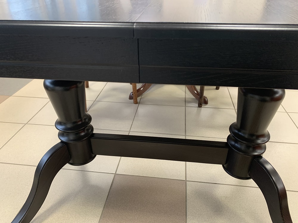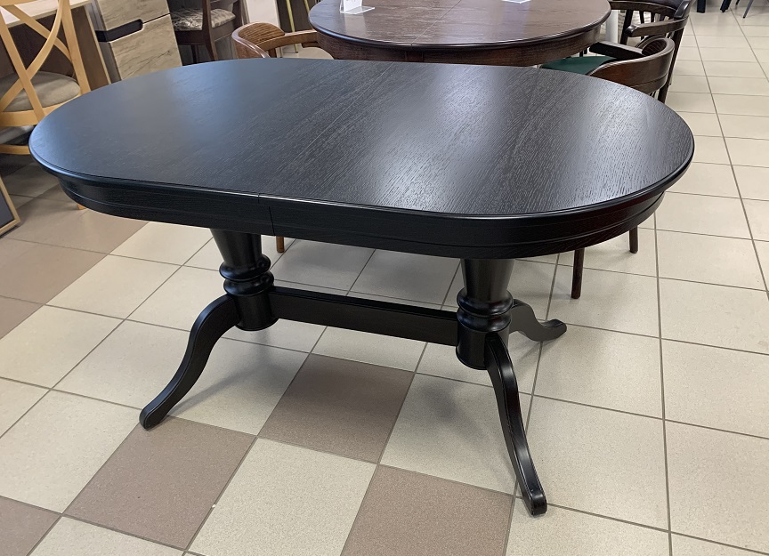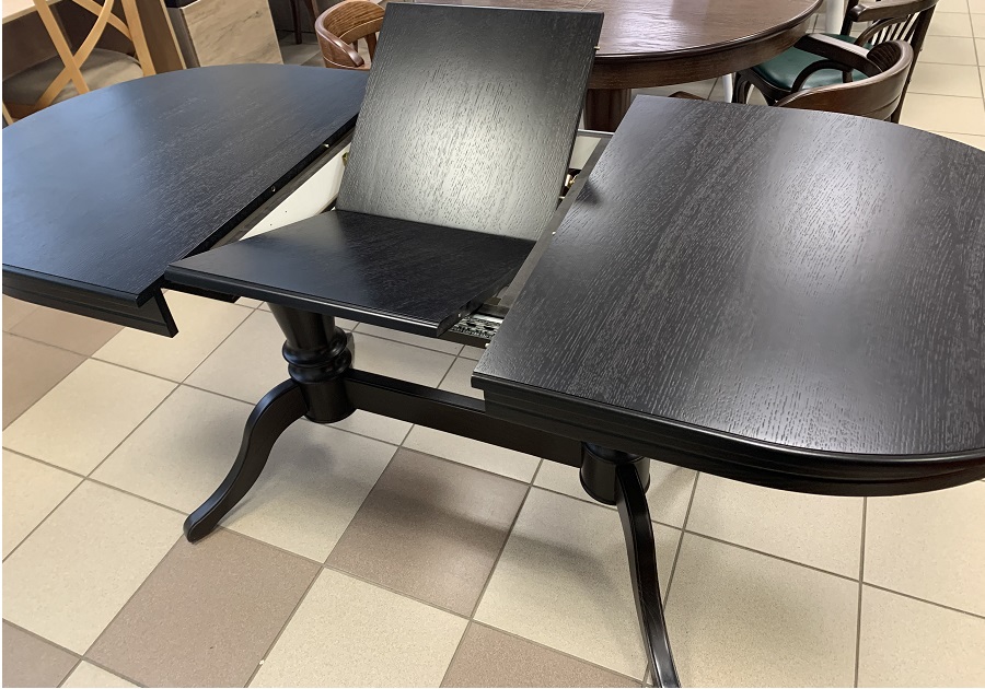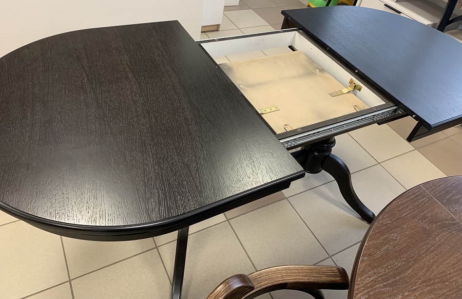 Раздвижной стол на двух ногах, вставка "Бабочка " располагается внутри столешницы, механизм раскладывания - металлические направляющие. Столешница изготовлена из МДФ, верх столешницы матовый, отделана шпоном дуба, подстолье - массив бука. Цвет Венге.