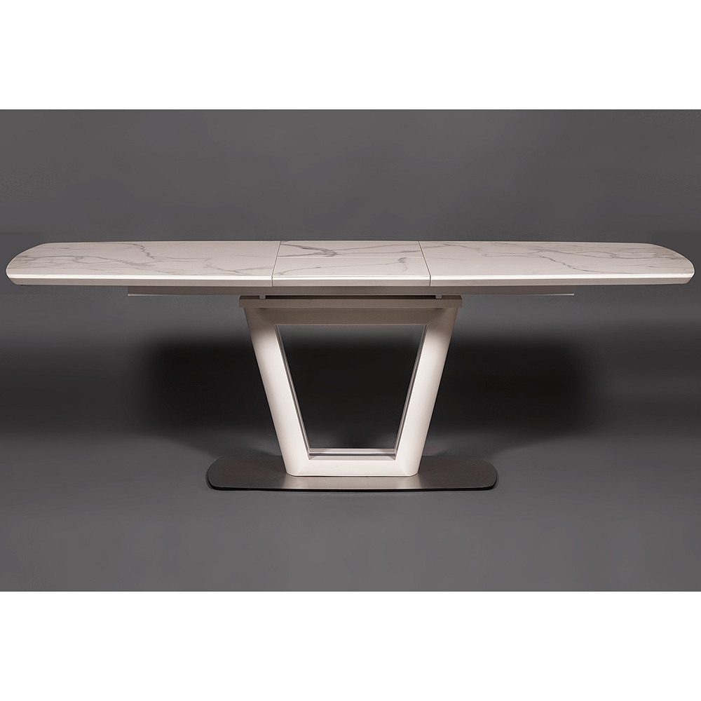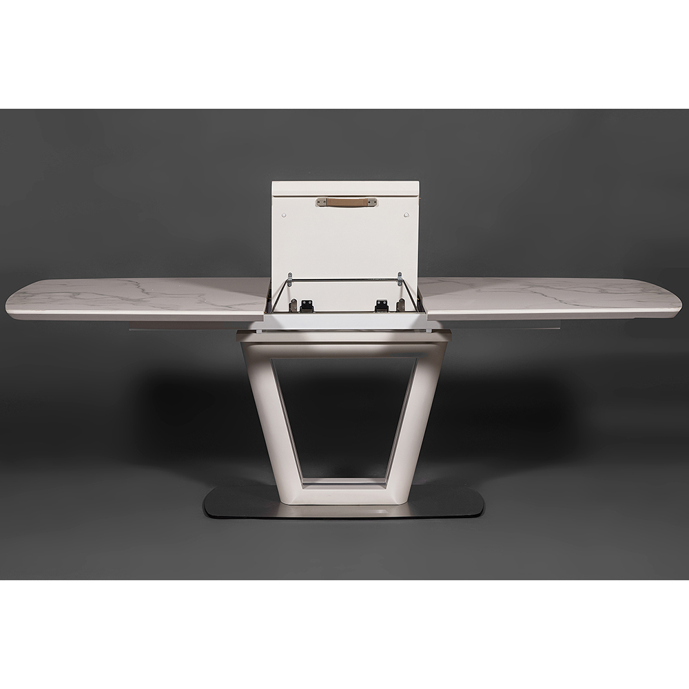 Уникальный раскладной стол с керамической испанской столешницей под белый мрамор. Благодаря раскладной столешницы, вы легко и быстро сможете создать несколько дополнительных посадочных мест для ваших гостей. Модель отличается надежностью, практичностью, простотой в уходе и удобством в использовании. Представлен в единственном цвете: опора - слоновая кость/ столешница - белый мрамор.