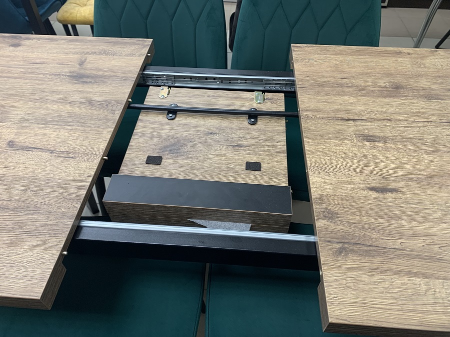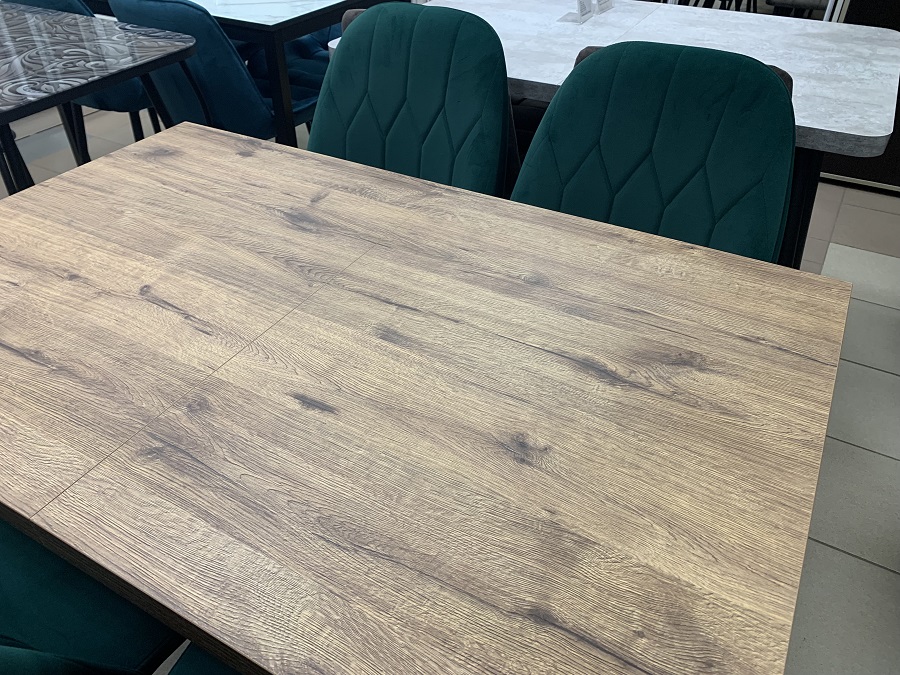 Стол обеденный Лидер 120 Дуб Велингтон - оригинальный и недорогой стол на металлокаркасе для уютной кухни. Столешница выполнена из ЛДСП 32 мм. Опоры металлические черного цвета. Вставка позволяет увеличить длину стола на 400 мм.