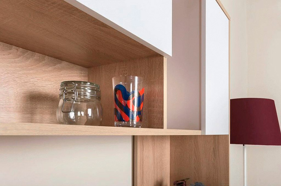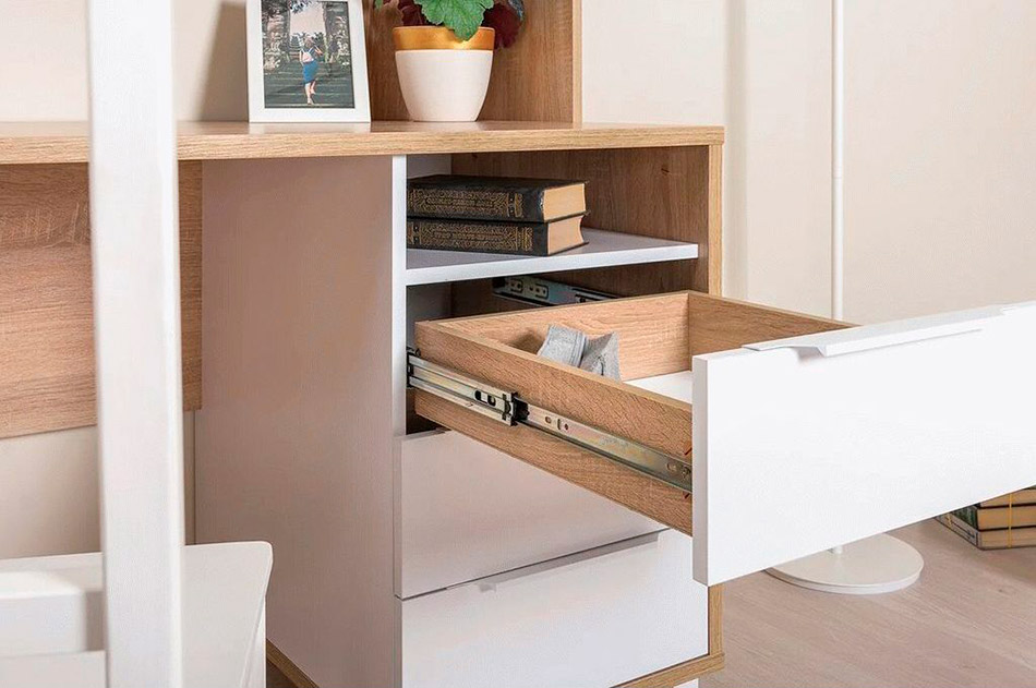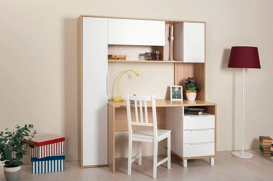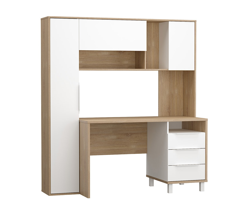 Стол рабочий Комфорт 12.95 подойдет в каждый интерьер. Это целый домашний офис, куда помимо широкой рабочей поверхности входит тумба с тремя выдвижными ящиками на шариковых направляющих, шкаф пенал с шестью вместительными полками, а также открытые и закрытые ниши на верхнем ярусе. Все дверцы оснащены четырехшарнирными петлями, а вехняя откидная полка - газлифтом. Ручки - пластик. В этом модуле есть все для удобной и плодотворной работы ЛДСП: 16 мм.