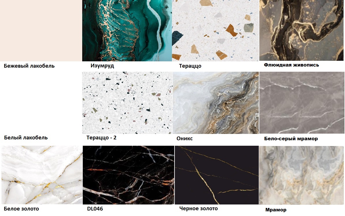 Варианты цветаБежевый лакобель, Белый лакобель, Белое золото, Изумруд, Тераццо 2DL046, DL 046, Тераццо, Оникс, Чёрное золото, Флюидная живопись, Бело-серый мрамор, Мрамор, Черный мрамор, Белый мрамор, Белый мрамор 2, Серый мрамор, Бежевый мрамор, Тропический мрамор, Гранит, Агат, Onyx 08
