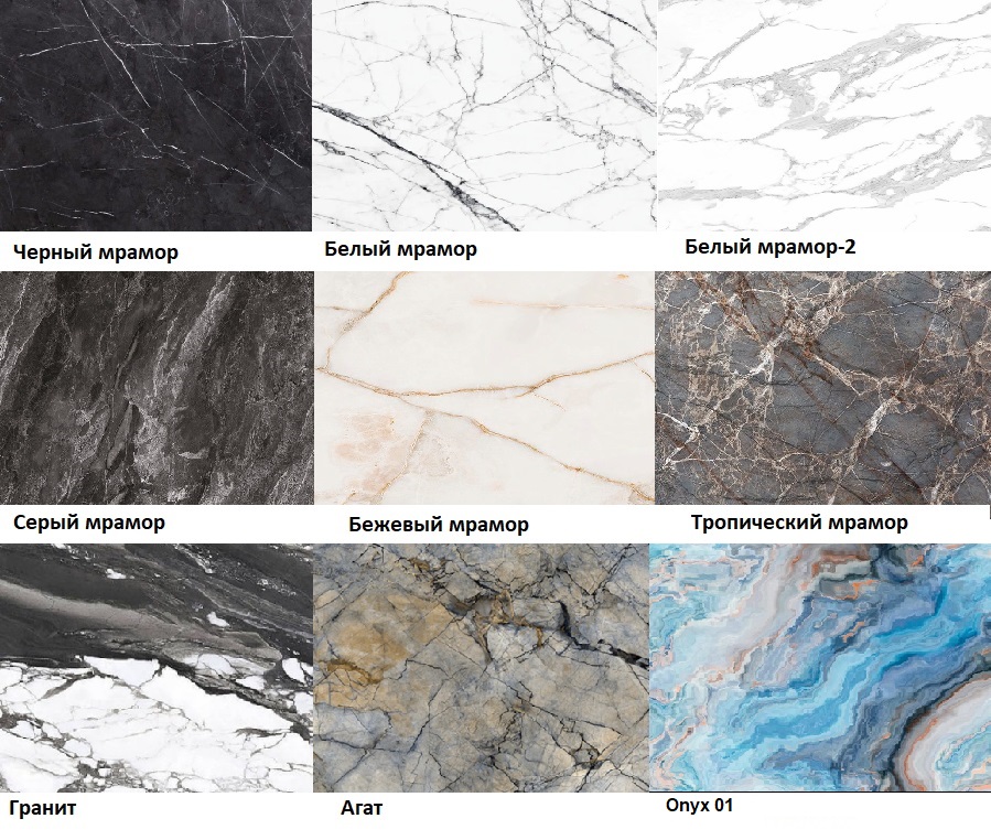 Варианты цветаЧерный мрамор, Белый мрамор, Белый мрамор-2, Серый мрамор, Бежевый мрамор, Тропический мрамор, Гранит, Агат, Бежевый лакобель, Изумруд, Тераццо, Тераццо 2, Белый лакобель, Оникс, Белое золото, DL 046 (Гэлакси), Чёрное золото, Onyx 08