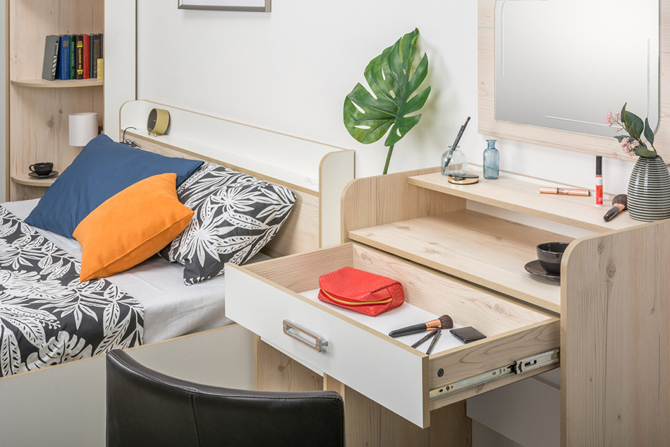 Туалетный стол Веста 12.47 - это 2 в 1. Утром туалетный стол, а вечером рабочее место. Достаточно убрать верхнюю полку, чтобы увеличить пространство и с удобством расположить ноутбук.