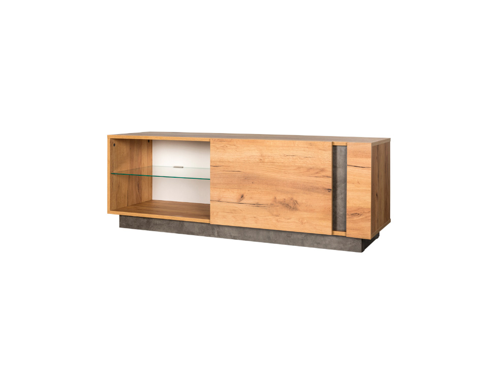 Тумба Арчи - вместительная изящная тумба для гостиной Арчи. Может использоваться как подставка под телевизор. Ширина позволяет разместить любой современный телевизор. На стеклянную полку вы можете поставить любимый сувенир или фотографию, она не закрыта стеклом. За дверцей располагается большая зона для хранения. Сочетание цвета: Дуб Золотой Craft/Камень темный. Шкаф полностью сделан из высококачественного ЛДСП. Задний щит- ДВП. Дверь на четырехшарнирных петлях без доводчиков. В тумбе 2 полки (1 стеклянная). Дверь открывается нажатием (механизм push-to-open). Установлена подсветка за стеклом по торцу полки. Собирается на любую сторону.